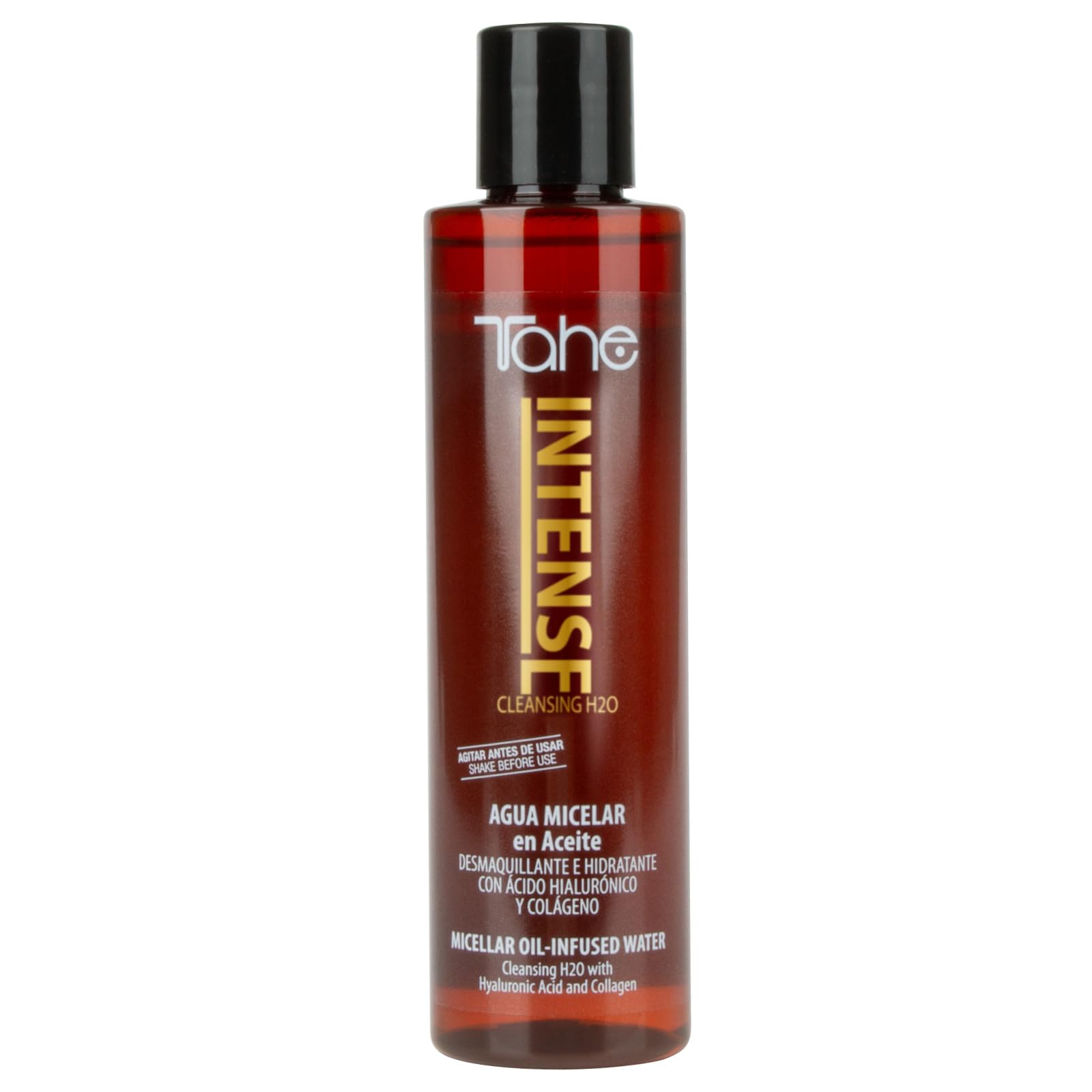 200 ml. Makeup remover and moisturizer: Deeply cleanses while preserving the skin's moisture. Enriched with hyaluronic acid and collagen: Promotes skin hydration and suppleness. In addition to ensuring optimal cleansing, it leaves the skin feeling comfortable and intensely moisturized. Tahe Intense Micellar Water gently and thoroughly removes all traces of makeup and impurities from the face and eyes. Bi-phase micellar cleansing oil.200 ml. Démaquillante et hydratante : Nettoie en profondeur tout en préservant l'hydratation de la peau. Enrichie en acide hyaluronique et collagène : Favorise l'hydratation et la souplesse de la peau. En plus d'assurer un nettoyage optimal, elle laisse la peau confortable et intensément hydratée. L'Eau Micellaire Intense de Tahe élimine en douceur et en profondeur toutes les traces de maquillage et d'impuretés du visage et des yeux. Eau micellaire biphasée démaquillante en huile Intense.Tahe Intense Eau micellaire biphasée démaquillante en huile, enrichie en Acide Hyaluronique et Collagène, 200 ml