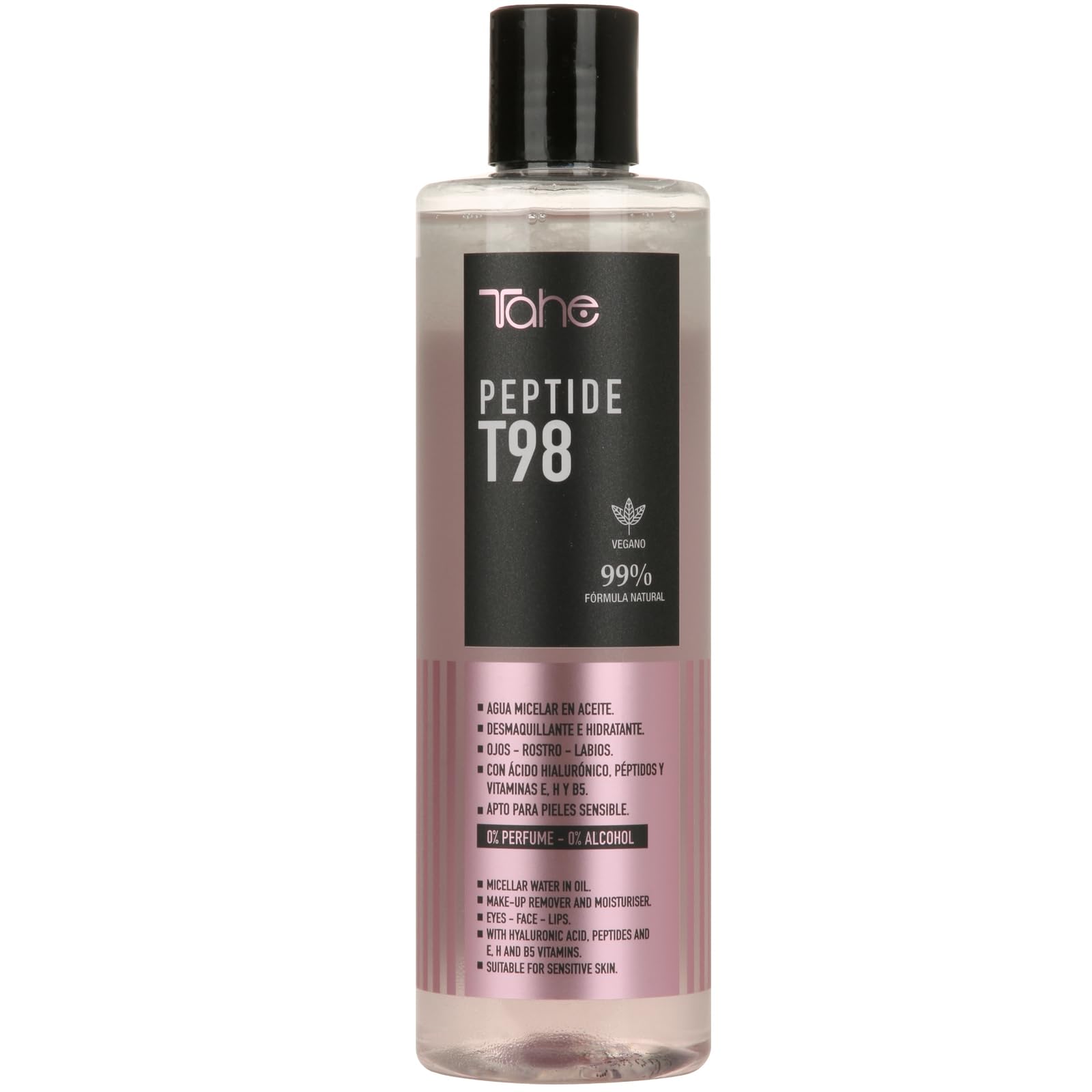 Are you looking for an effective makeup remover that respects your sensitive skin while nourishing it? Tahe Peptide T98 Micellar Water is the ideal solution. This innovative product combines the effectiveness of a deep cleanser with the benefits of an intensive moisturizing treatment. Key Features: - Multifunctional makeup remover: Ideal for face, eyes and lips. - Hydration with hyaluronic acid: Known for its hydrating properties, hyaluronic acid keeps skin soft and radiant. - Enriched with peptides and vitamins: The combination of peptides, vitamins E, H and B5 nourishes the skin, making it radiant and rejuvenated. - Gentle formula: 0 perfume, 0 alcohol, specially designed for sensitive skin. 99 natural and vegan ingredients: Respectful of the environment and animals, an essential for fans of conscious beauty. - Proven results: Gently but effectively removes all types of makeup and impurities, without leaving a greasy or sticky film. Clinically tested. With Peptide T98 Micellar Water, enjoy perfectly cleansed and incredibly hydrated skin. Its gentle but effective formula guarantees deep cleansing without irritating the skin, while preserving its natural balance and beauty. DIRECTIONS FOR USE Shake before use. Soak a cotton pad with a sufficient quantity of product, then gently rub the area to be removed. SAFETY WARNING For external use only. 300 ml. 99 natural ingredients and vegan. Enriched with peptides and vitamins: The combination of peptides, vitamins E, H and B5 nourishes the skin, making it radiant and rejuvenated. Hyaluronic acid hydration: Known for its hydrating properties, hyaluronic acid keeps skin soft and radiant. This innovative product combines the effectiveness of a deep cleanser with the benefits of an intensive hydrating treatment. Peptide T98 Eyes Micellar Water in Oil – For face, eyes and lips. Vous recherchez un démaquillant efficace qui respecte votre peau sensible tout en la nourrissant ? L'Eau Micellaire Peptide T98 de Tahe est la solution idéale. Ce produit innovant associe l'efficacité d'un nettoyant profond aux bienfaits d'un traitement hydratant intensif. Caractéristiques clés: - Démaquillant multifonctionnel: Idéal pour le visage, les yeux et les lèvres. - Hydratation à l'acide hyaluronique: Reconnu pour ses propriétés hydratantes, l'acide hyaluronique maintient la peau douce et éclatante. - Enrichi en peptides et vitamines: La combinaison de peptides, de vitamines E, H et B5 nourrit la peau, la rendant radieuse et rajeunie. - Formule douce: 0 parfum, 0 alcool, spécialement conçue pour les peaux sensibles. 99 d'ingrédients naturels et végane : Respectueux de l'environnement et des animaux, un indispensable pour les adeptes de la beauté consciente. - Résultats prouvés: Élimine en douceur mais efficacement tous les types de maquillage et impuretés, sans laisser de film gras ou collant. Cliniquement testé. Avec l'Eau Micellaire Peptide T98, profitez d'une peau parfaitement nettoyée et incroyablement hydratée. Sa formule douce mais performante garantit un nettoyage en profondeur sans irriter la peau, tout en préservant son équilibre naturel et sa beauté. MODE D'EMPLOI Agitez avant utilisation. Imprégnez un coton d'une quantité suffisante de produit, puis frottez délicatement la zone à démaquiller. AVERTISSEMENT DE SÛRETÉ A usage externe uniquement. 300 ml. 99 d'ingrédients naturels et végane. Enrichi en peptides et vitamines : La combinaison de peptides, de vitamines E, H et B5 nourrit la peau, la rendant radieuse et rajeunie. Hydratation à l'acide hyaluronique : Reconnu pour ses propriétés hydratantes, l'acide hyaluronique maintient la peau douce et éclatante. Ce produit innovant associe l'efficacité d'un nettoyant profond aux bienfaits d'un traitement hydratant intensif. Eau micellaire en huile Peptide T98 Eyes – Pour le visage, les yeux et les lèvres.