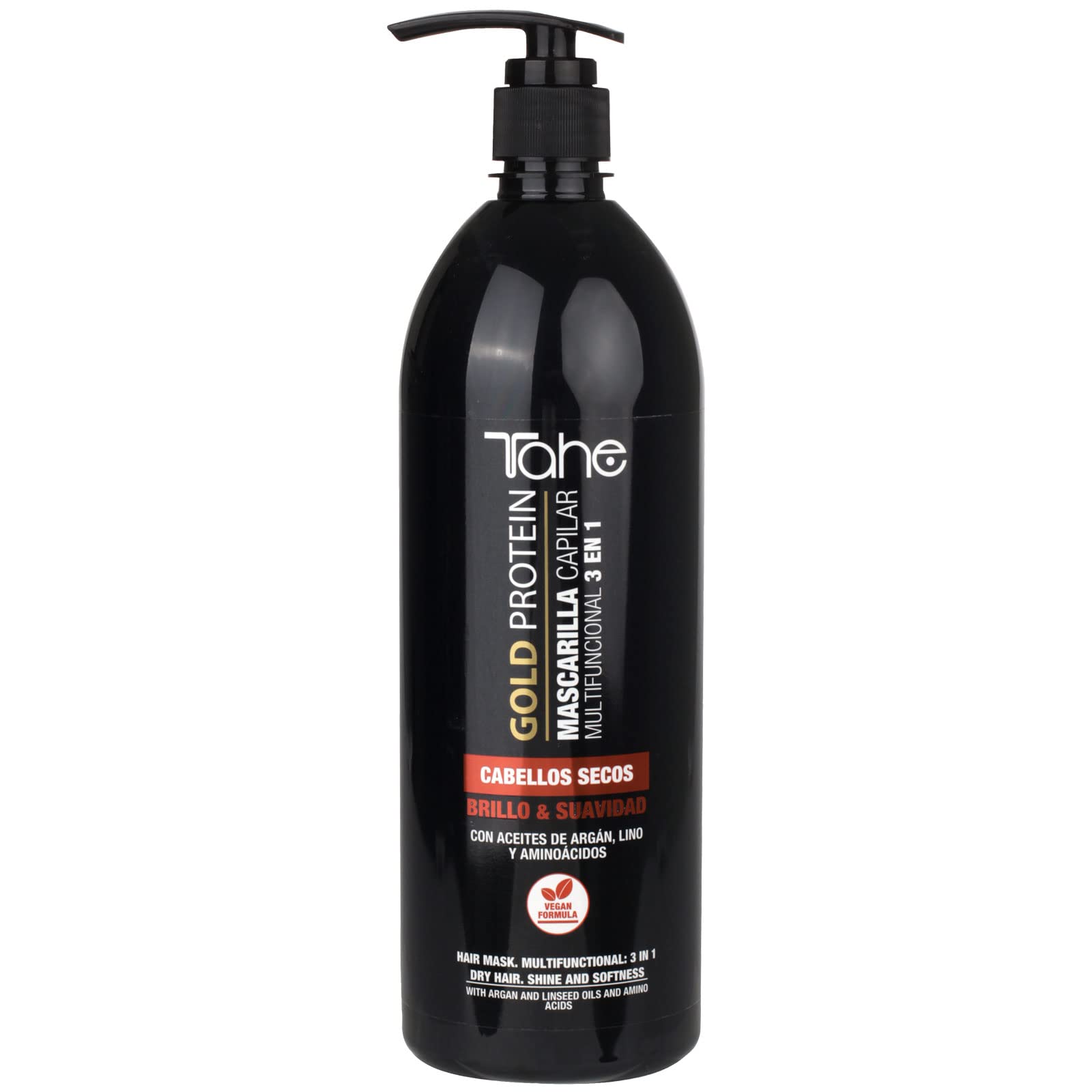 Gold Protein Multifunctional Hair Mask for Dry Hair: Shine and Softness. Concentrated formula that strengthens the hair structure, fills in the hair shaft, and reduces breakage. Provides deep conditioning and intense shine. Does not weigh hair down. Multidisciplinary: 3 in 1. Vegan formula. INGREDIENTS Aqua (Water), Cetearyl Alcohol, Bis-Aminopropyl Dimethicone, Behentrimonium Chloride, Panthenol, Pantolactone, Helianthus Annuus (Sunflower) Seed Oil, Cocos Nucifera (Coconut) Oil, Linum Usitatissimum (Linden) Seed Oil, Persea Gratissima (Persea) Oil, Argania Spinosa Kernel Oil, Macadamia Ternifolia (Macadamia) Seed Oil, Olea Europaea (Olive) Oil, Rosmarinus Officinalis (Rosemary) Leaf Extract, Hydrolyzed Soy Protein, Tetrasodium EDTA, Citric Acid, Sorbic Acid, Phenoxyethanol, Caprylyl Glycol, Benzoic Acid, Parfum (Fragrance) DIRECTIONS 1. NOURISHING TREATMENT. As a pre-shampoo treatment. On dry hair, apply the required amount and distribute through sections of hair. Leave on for approximately 5 minutes. Rinse and shampoo as usual. Use: Once a week. 2. Instant Conditioner. Apply the required amount to clean, damp hair and style. Rinse thoroughly with water, no waiting time. Use regularly. 3. Nourishing Mask. Apply a sufficient amount to clean, damp hair and style. Leave on for approximately 3-5 minutes. Rinse thoroughly with water. Use 2-3 times per week. See moreDoesn't weigh hair down. Provides deep conditioning and intense shine. Concentrated formula that strengthens the hair structure, fills in the hair shaft, and reduces breakage. Shine and softness. Gold Protein multifunctional hair mask for dry hair.Tahe Gold Protein Masque Capillaire 3 en 1 pour des Cheveux Secs, Éclat et Douceur (1000 ml)DESCRIPTION DU PRODUIT DESCRIPTION DU PRODUIT Masque capillaire multifonctionnel cheveux secs Gold Protein, Éclat et Douceur. Formule concentrée qui renforce la structure des cheveux, remplit la structure capillaire et réduit la cassure. Apporte un soin profond et un éclat intense. N alourdit pas les cheveux. Multidisciplinaire: 3 en 1. FORMULE VÉGANE. INGRÉDIENTS Aqua (Water), Cetearyl Alcohol, Bis-Aminopropyl Dimethicone, Behentrimonium Chloride, Panthenol, Pantolactone, Helianthus Annuus Seed Oil, Cocos Nucifera Oil, Linum Usitatissimum Seed Oil, Persea Gratissima Oil, Argania Spinosa Kernel Oil, Macadamia Ternifolia Seed Oil, Olea Europaea Oil, Rosmarinus Officinalis Leaf Extract, Hydrolyzed Soy Protein, Tetrasodium EDTA, Citric Acid, Sorbic Acid, Phenoxyethanol, Caprylyl Glycol, Benzoic Acid, Parfum (Fragrance) MODE D'EMPLOI 1. TRAITEMENT DE NUTRITION. Comme pré-shampooing. Sur cheveux secs, appliquer la quantité nécessaire et répartir par mèches de cheveux. Laisser agir pendant environ 5 minutes. Rincer et procéder au lavage habituel avec le shampooing. Usage :1 fois par semaine. 2. APRÈS-SHAMPOOING instantané. Sur cheveux propres et humides, appliquer la quantité nécessaire et coiffer. Rincer abondamment à l eau, sans temps d'exposition. Usage régulier. 3. MASQUE nutritif. Sur cheveux propres et humides, appliquer en quantité suffisante et coiffer. Laisser agir environ 3-5 minutes. Rincer abondamment à l eau. Usage : 2-3 fois par semaine. Voir plusN alourdit pas les cheveux. Apporte un soin profond et un éclat intense. Formule concentrée qui renforce la structure des cheveux, remplit la structure capillaire et réduit la cassure. Éclat et Douceur. Masque capillaire multifonctionnel cheveux secs Gold Protein.