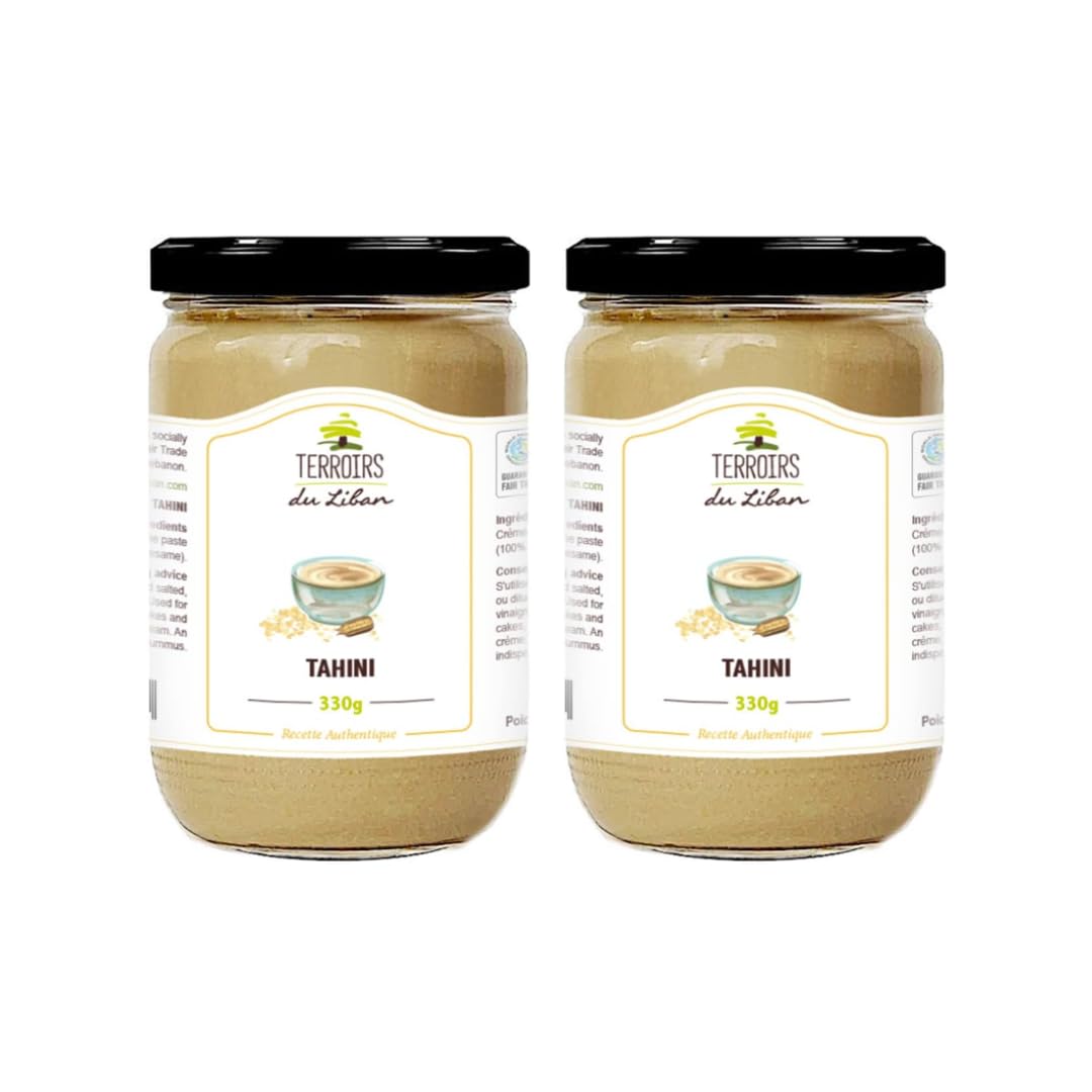 store for 2 years in a dry place. Use in savory and sweet dishes, pure or diluted in water. Perfect for salad dressings, sauces, spreads, cakes, and tarts. A great substitute for cream. An essential ingredient in hummus. Made from exceptionally high-quality sesame seeds, this tahini perfectly captures the essence of Lebanese cuisine. Its incredibly creamy texture reveals delicate hazelnut notes on the palate. An emblem of Levantine cuisine, it is a key ingredient in hummus and baba ghanoush. It is also rich in healthy fats, minerals, and antioxidants. This package contains: 2 x 330g jars of tahini.Se conserve 2 ans au sec. S'utilise en salé et sucré, pur ou dilué dans l'eau. Pour les vinaigrettes, sauces, tartinables, cakes et tartes. Remplace la crème. Un ingrédient indispensable du houmous. Confectionné à partir de graines de sésame de qualité exceptionnelle, ce tahini retranscrit à lui seul toute la typicité du terroir libanais. Sa texture infiniment crémeuse dévoile en bouche de fines notes de noisette. Emblème de la cuisine levantine, il constitue un ingrédient incontournable du houmous et du baba ghannouj. Il est également riche en bons lipides, minéraux et antioxydants. Ce colis contient : 2 Tahinis 2x330g.Tahini Libanais Authentique- 100 Purée de Sésame- Riche en Protéines, Fibres Antioxydants, Vegan - Certifié Commerce Equitable- 2x330g- Terroirs du Liban