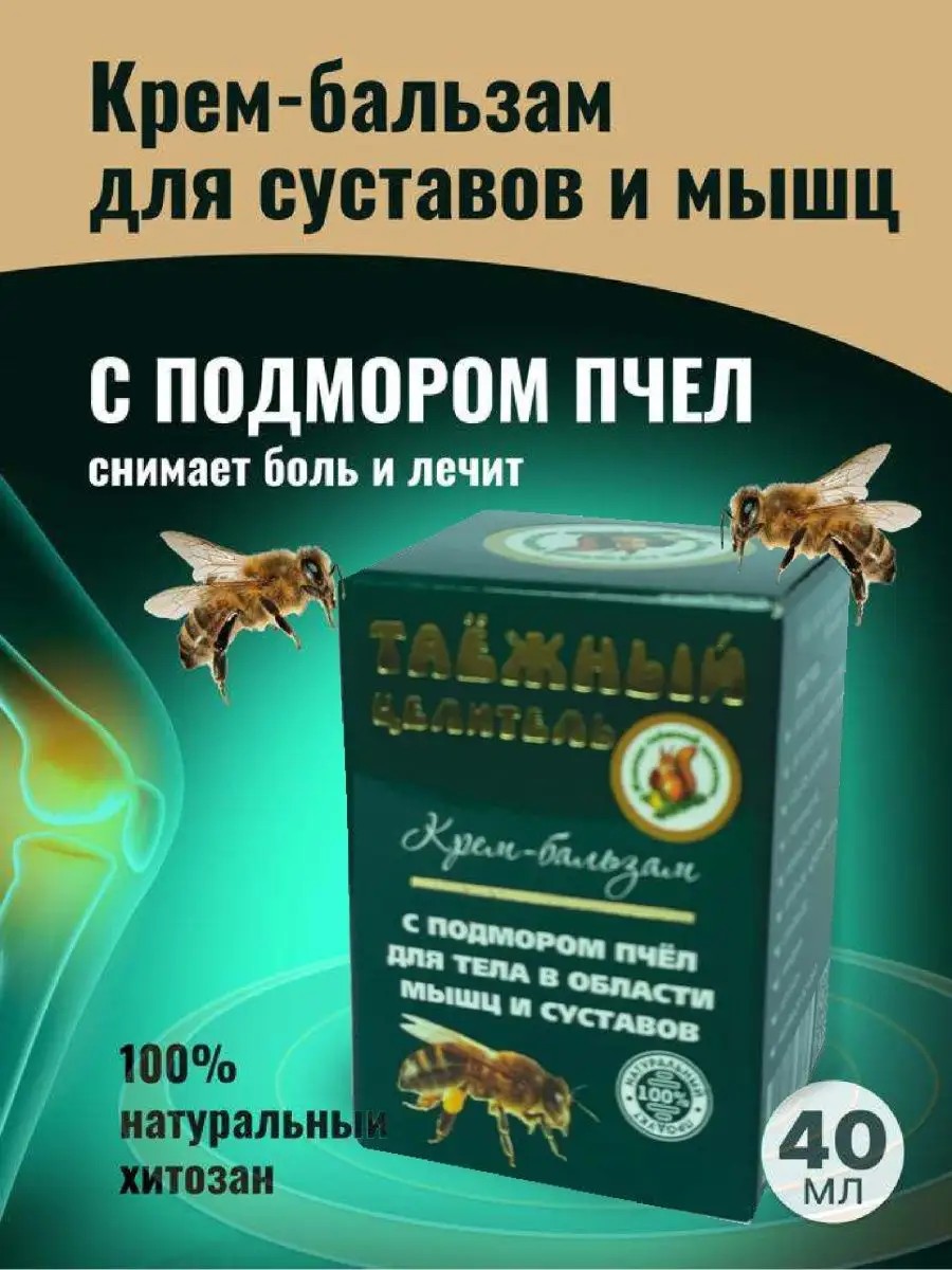 Крем бальзам Таежный целитель с подмором пчел это натуральная органическая мазь для суставов и мышц, с интенсивным глубоко проникающим действием, на основе природного хитозана из подмора пчел, помогает от боли и воспалении в суставах, мышцах. Высокоэффективное средство для активизации кровообращения, нормализации метаболизма в тканях. Эффект достигается благодаря уникальному составу, собранному из натуральных компонентов по народным рецептам. Состав: подмор пчел-кладезь витаминов и 100% натуральный хитозан, оказывает гемостатическое и обезболивающее действие, экстракт сосновых почек, каштан конский, пчелиный яд-сильное биологически активное вещество, которое активизирует выработку в организме противовоспалительных гормонов, оказывает разогревающий, обезболивающий, бактерицидный эффект, улучшает питание суставов. повышает проницаемость кожных покровов, способствует глубокому проникновению лечебных компонентов в проблемную область. Мазь для суставов рекомендуется для лечения и профилактики заболеваний опорно-двигательного аппарата, артроза, полиартрита, остеохондроз, растяжениях и травмах, мужчинам, женщинам при болях в коленях, болях в ногах, болях в шее, болях в локтях, пояснице, кисти рук, в плече. Для всей семьи , подросткам и взрослым, спортсменам, дачникам, садоводам, мужчинам, женщинам. Подарок маме, папе, бабушке, дедушке, мужу, жене, себе. Для достижения эффекта необходимо курсовое применение. Без искусственных добавок.