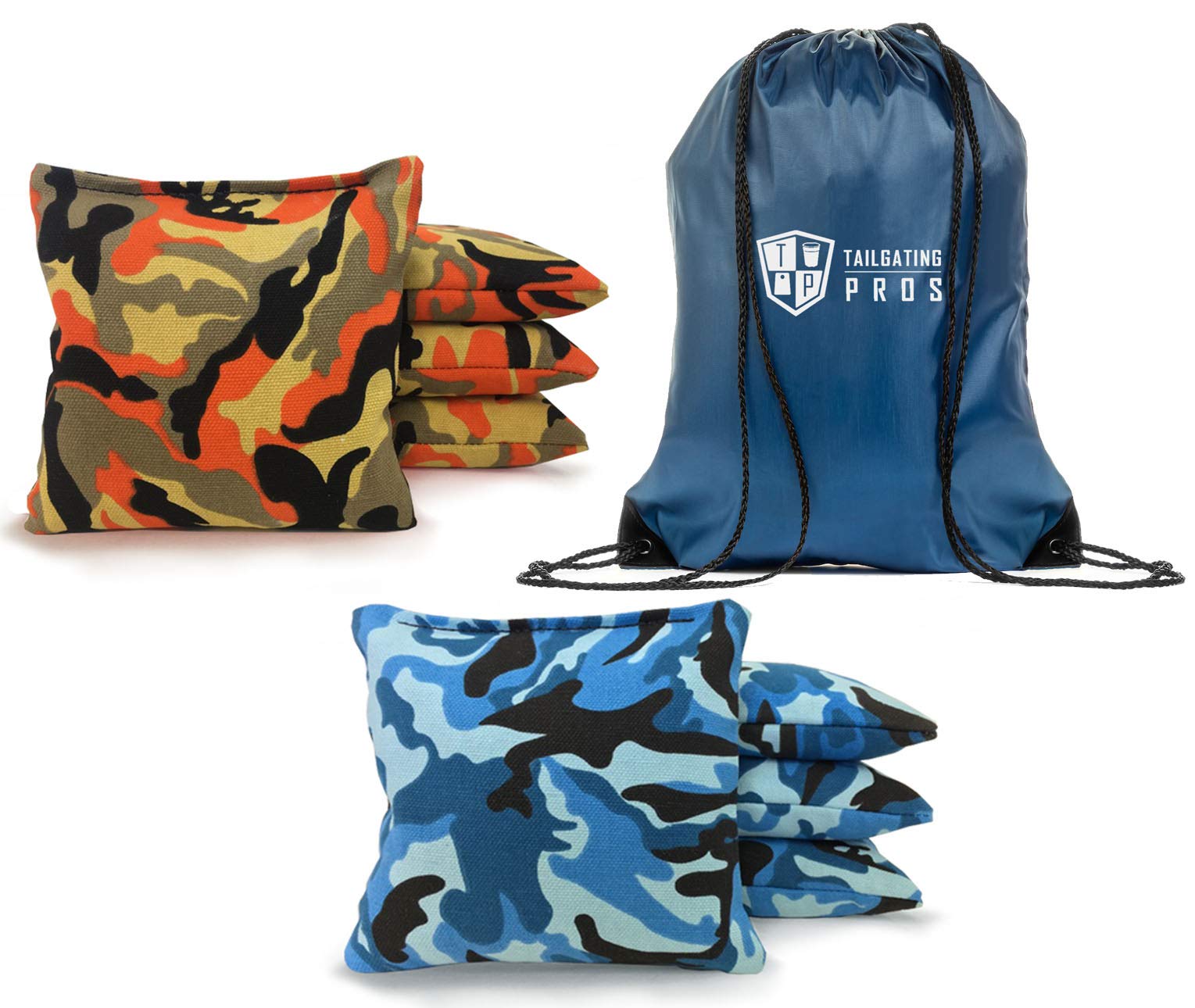 Tailgating Pros Cornhole Bags - 8 Regulation Size Corn Hole Bags with a Carrying Tote - 25+ Colors Orange Camo/Blue Camo