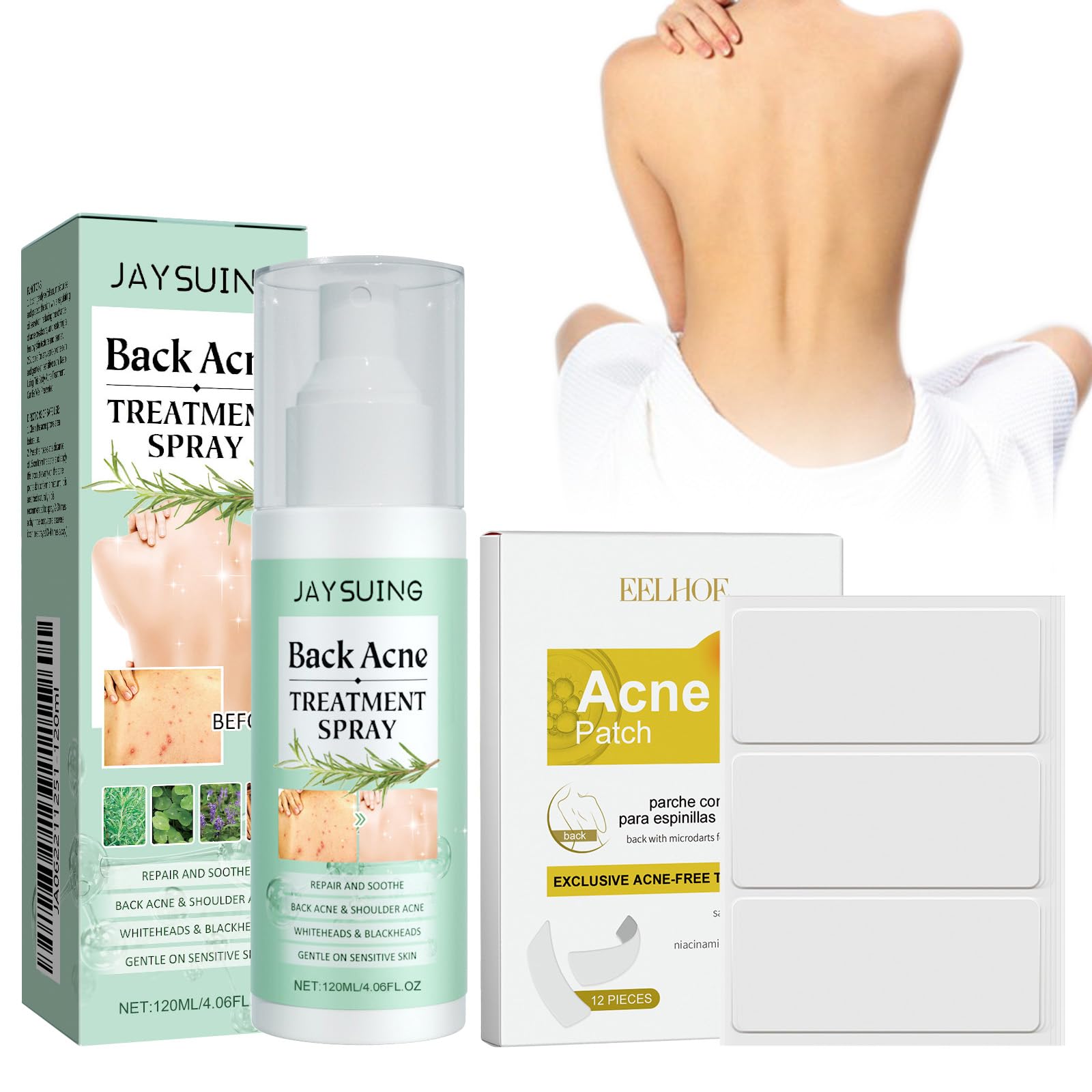 The acne back spray is enriched with soothing ingredients that gently exfoliate and deeply cleanse pores, relieve acne-related skin discomfort and redness and provide a cooling sensation that leaves the skin feeling calm and comfortable. INSTRUCTIONS FOR USE Spray the product on the affected skin area, such as the back or body, and let it dry. Use it as needed throughout the day and night for continuous care. SAFETY WARNING no See moreFast Absorption : The light texture of the acne sprays is easily absorbed from the skin, leaving the skin hydrated for a long time. Brightens the skin complexion : In addition to its basic repairing function, the back acne spray also contains ingredients that brighten the skin complexion. These ingredients can improve uneven skin tone caused by acne and make the skin on the back brighter and smoother. Potent and Mild Formula : Acne Complex Spray contains powerful antibacterial ingredients and ingredients that promote skin cell regeneration. It not only effectively kills bacteria on the skin's surface to prevent acne from worsening due to bacterial infections, but also quickly repairs damaged skin tissue, scars and pimples caused by acne, returning the skin to health. Dual Action, All-Weather Acne : The spray is refreshing and oil-regulating, preventing the formation of new acne. The acne patch adheres to the skin, absorbs secretions and isolates bacterial contamination, providing continuous care throughout the day and night and preventing recurring attacks. Acne Back Spray : The acne back spray is enriched with soothing ingredients that gently exfoliate and deeply cleanse pores, relieve acne-related skin discomfort and redness, and provide a cooling sensation that leaves the skin feeling calm and comfortable.Acne Rug Spray, Acne Complex Spray, Rug Acne Behandelingsspray, Hydrocolloïde Acne Patches, Puistjes Patches voor Rug en Lichaam, Natuurlijk, Mild voor de Huid De acne rug spray is verrijkt met verzachtende ingrediënten die de poriën zachtjes exfoliëren en diep reinigen, acne-gerelateerd huidongemak en roodheid verlichten en een verkoelend gevoel geven waardoor de huid kalm en comfortabel aanvoelt. GEBRUIKSAANWIJZING Spuit het product op de beïnvloede huidarea, zoals de rug of het lichaam, en laat het drogen. Gebruik het als nodig gedurende de dag en nacht voor continue verzorging. VEILIGHEIDSWAARSCHUWING no Meer bekijkenSchnelle Absorption : Die leichte Textur des Aknesprays wird leicht von der Haut aufgenommen, schließt die Feuchtigkeit für eine lange Zeit ein, hält die Haut hydratis. Verheldert de huidteint : Naast de basisherstellende functie bevat de acnespray voor de rug ook ingrediënten die de huidteint verhelderen. Deze ingrediënten kunnen een ongelijkmatige teint veroorzaakt door acne verbeteren en de huid op de rug helderder en gladder maken. Krachtige en milde formule : Acne Complex Spray bevat krachtige antibacteriële ingrediënten en ingrediënten die de regeneratie van huidcellen bevorderen. Het doodt niet alleen effectief bacteriën op het huidoppervlak om te voorkomen dat acne verergert door bacteriële infecties, maar herstelt ook snel beschadigd huidweefsel, littekens en puistjes veroorzaakt door acne, waardoor de huid weer gezond wordt. Dubbele Werking, All-Weather Acne : De spray is verfrissend en olieregulerend, waardoor de vorming van nieuwe acne wordt voorkomen. De acne patch hecht zich aan de huid, absorbeert afscheidingen en isoleert bacteriële besmetting, biedt continue verzorging gedurende de dag en nacht en voorkomt terugkerende aanvallen. Acne Rug Spray : De acne rug spray is verrijkt met verzachtende ingrediënten die de poriën zachtjes exfoliëren en diep reinigen, acne-gerelateerd huidongemak en roodheid verlichten en een verkoelend gevoel geven waardoor de huid kalm en comfortabel aanvoelt.