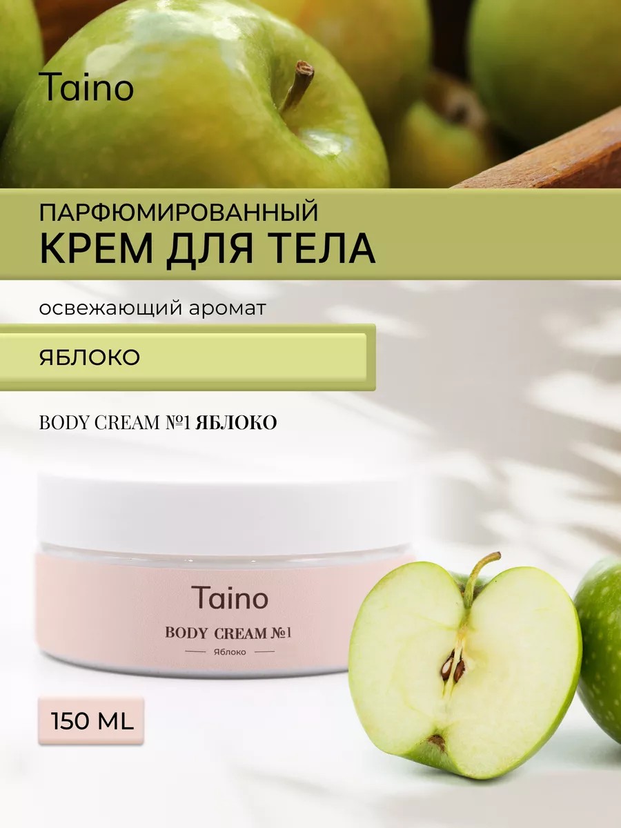 Хотите иметь красивую и ухоженную кожу? Body cream №1 Taino – именно то, что вам нужно. Крем с великолепным ароматом Зеленого Яблока сочетает в себе свойства увлажняющего лосьона и молочка, но, в отличии от них, содержит ценные масла и натуральные компоненты. В составе комплекс масел и мочевина. Комплекс масел глубоко увлажняет дерму, оказывает на кожу защитное и регенеративное воздействие. Мочевина создает запасы влаги в эпидермисе, мягко и деликатно стимулирует процесс обновления клеток, не вызывая раздражения и дискомфорта. Крем насыщает кожу влагой и нормализует водный баланс кожи. Натуральные компоненты проникают в глубокие слои дермы, продолжая действовать на протяжении 24-48 часов. Помогает избавиться от сухости, стянутости, раздражения и шелушения. После применения на поверхности кожи создается невидимая липидная пленка, которая защищает от негативных внешних воздействий. Крем легко впитывается, не оставляет жирных следов и обладает чудесным ароматом. Аромат Яблока, тонизирующий, освежающий и бодрящий, дарит мгновения счастья, заряжает положительными эмоциями, снимает стресс и поднимает настроение. Крем прекрасно питает и увлажняет кожу делая ее упругой и эластичной. Он подходит как молодым девушкам, так и зрелым женщинам с любым типом кожи. Нанесите крем на чистую кожу мягкими массирующими движениями и наслаждайтесь чарующим ароматом и бархатной кожей, к которой хочется прикасаться снова и снова. Уходовая косметика Taino — это прекрасный подарок для близкого человека или себя любимой. Превратите уход за собой в настоящий ритуал, который подарит положительные эмоции, поможет восстановить силы и придаст энергии. Taino - НЕЖНО… БЕРЕЖНО… ЛЮБЯ…