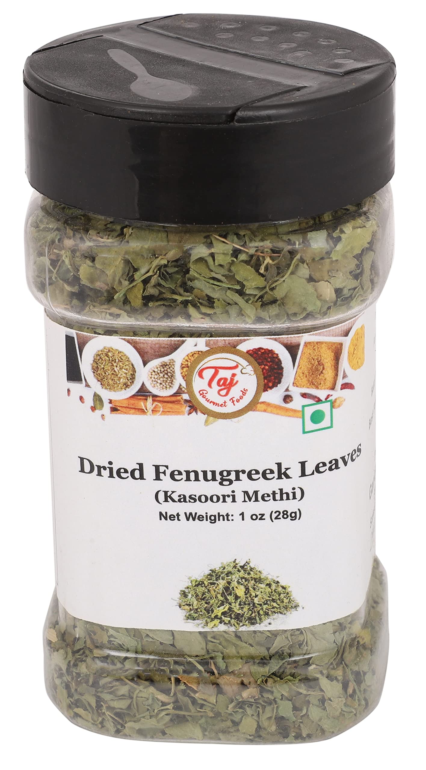 Taj Kasoori Methi Fenugreek Leaves Premium Quality Product (Kasuri Methi Dried Fenugreek Leaves)1oz (28g) 1 Ounce (Pack of 1)
