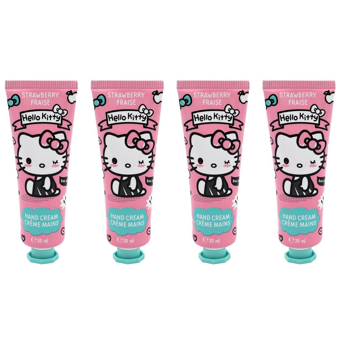 This set of four 30ml Hello Kitty strawberry hand creams offers a smooth texture that absorbs quickly into the skin without leaving a greasy residue. Enriched with shea butter, naturally rich in vitamin E, each cream nourishes and protects hands daily. Its formula also contains beeswax, a source of vitamin A, to intensely moisturize and strengthen the skin barrier against frequent washing and cold weather. Made with over 90 natural ingredients, vegan, and dermatologically tested. SAFETY WARNING For external use only.HELLO KITTY Your beauty essentials in the world of Hello Kitty, the beloved Japanese icon of children and fans of all ages. A perfect gift to bring style, fun, and tenderness to every skincare routine. NATURAL FORMULA Over 90 natural ingredients, vegan, and dermatologically tested for confident use. HYDRATION STRENGTHENING Contains beeswax, rich in vitamin A, to hydrate and strengthen the skin barrier against frequent washing and cold weather. NOURISHES PROTECTS Enriched with shea butter, naturally rich in vitamin E, to nourish and protect skin daily. PACK OF 4 - HELLO KITTY STRAWBERRY HAND CREAM 30ML The Hello Kitty hand cream offers a smooth texture that absorbs quickly, without leaving a greasy residue.Take Care Crèmes mains fraise Hello Kitty Nourrit protège la peau au quotidien Hydrate renforce la barrière cutanée 90 d'ingrédients naturels Vegan Lot de 4x 30mlDESCRIPTION DU PRODUIT DESCRIPTION DU PRODUIT Le lot de 4 crèmes mains 30ml Hello Kitty à la fraise offre une texture onctueuse qui pénètre rapidement la peau, sans laisser de fini gras. Enrichie en beurre de karité naturellement riche en vitamine E, chaque crème nourrit et protège les mains au quotidien. Sa formule contient également de la cire d'abeille, source de vitamine A, pour hydrater intensément et renforcer la barrière cutanée face aux lavages fréquents et au froid. Composée à plus de 90 d'ingrédients naturels, vegan et testée dermatologiquement. AVERTISSEMENT DE SÉCURITÉ Usage externe uniquement.HELLO KITTY Vos indispensables de beauté sous l'univers de Hello Kitty, l'icône japonaise adorée des enfants et des fans de tout âge. Un cadeau parfait pour apporter style, fun et tendresse à chaque moment de soin. FORMULE NATURELLE 90 d'ingrédients naturels, vegan et testée dermatologiquement pour une utilisation en toute confiance. HYDRATATION RENFORCEMENT Contient de la cire d'abeille, riche en vitamine A, pour hydrater et renforcer la barrière cutanée face aux lavages fréquents et au froid. NOURRIT PROTÈGE Enrichie en beurre de karité, naturellement riche en vitamine E, pour nourrir et protéger la peau au quotidien. LOT DE 4 - CRÈME MAINS 30 ML FRAISE HELLO KITTY La crème mains Hello Kitty offre une texture onctueuse qui pénètre rapidement, sans fini gras.