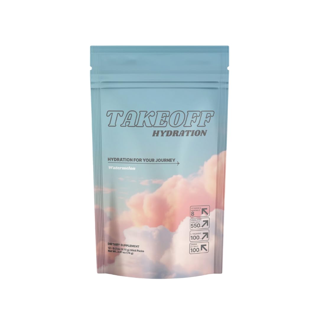 Takeoff Hydration is your ultimate in-flight companion. Whether you're a pilot, frequent flyer, flight attendant, or just taking a weekend getaway, air travel puts stress on your body. Dehydration, bloating, jet lag, and fatigue are common — but preventable. Our science-backed formula delivers fast-absorbing electrolytes and natural botanicals like organic ginger (for digestion), papaya (to ease bloating), and chamomile (for relaxation). Perfectly portioned in TSA-compliant stick packs, it's hydration without the hassle — or the sugar. ✓ Vegan ✓ Gluten-Free ✓ Zero Artificial Ingredients ✓ Made for Travel, Fitness, Everyday Wellness Stay sharp, stay calm, and stay hydrated — wherever your journey takes you. ?CONVENIENT TSA-FRIENDLY: Designed for your journey. Sleek, single-serving stick packs are lightweight, easy to pack, and TSA-friendly. Keep them in your carry-on for instant hydration anywhere, anytime. JUICY REFRESHING TASTE: Hydration should be a pleasure! Our Watermelon flavor is juicy, clean-tasting, with no artificial sweeteners. It dissolves quickly for a delicious, on-the-go wellness boost. PILOT-TRUSTED, SCIENCE-BACKED: Formulated for high-altitude demands. Our balanced, Zero-sugar formula with essential electrolytes like Magnesium maintains peak cognitive function and physical wellness. COMBAT JET LAG TRAVEL FATIGUE: Your secret weapon against exhaustion. Unlike sugary drinks, Takeoff Hydration offers Organic Ingredients for natural energy, Magnesium for muscle relaxation, and Zinc for immune support. Maximize every trip!. SUPERIOR HYDRATION FOR TRAVELERS: Fight dehydration! Each stick delivers precise Electrolytes, Magnesium, and Vitamins for efficient water absorption, leaving you refreshed and focused.