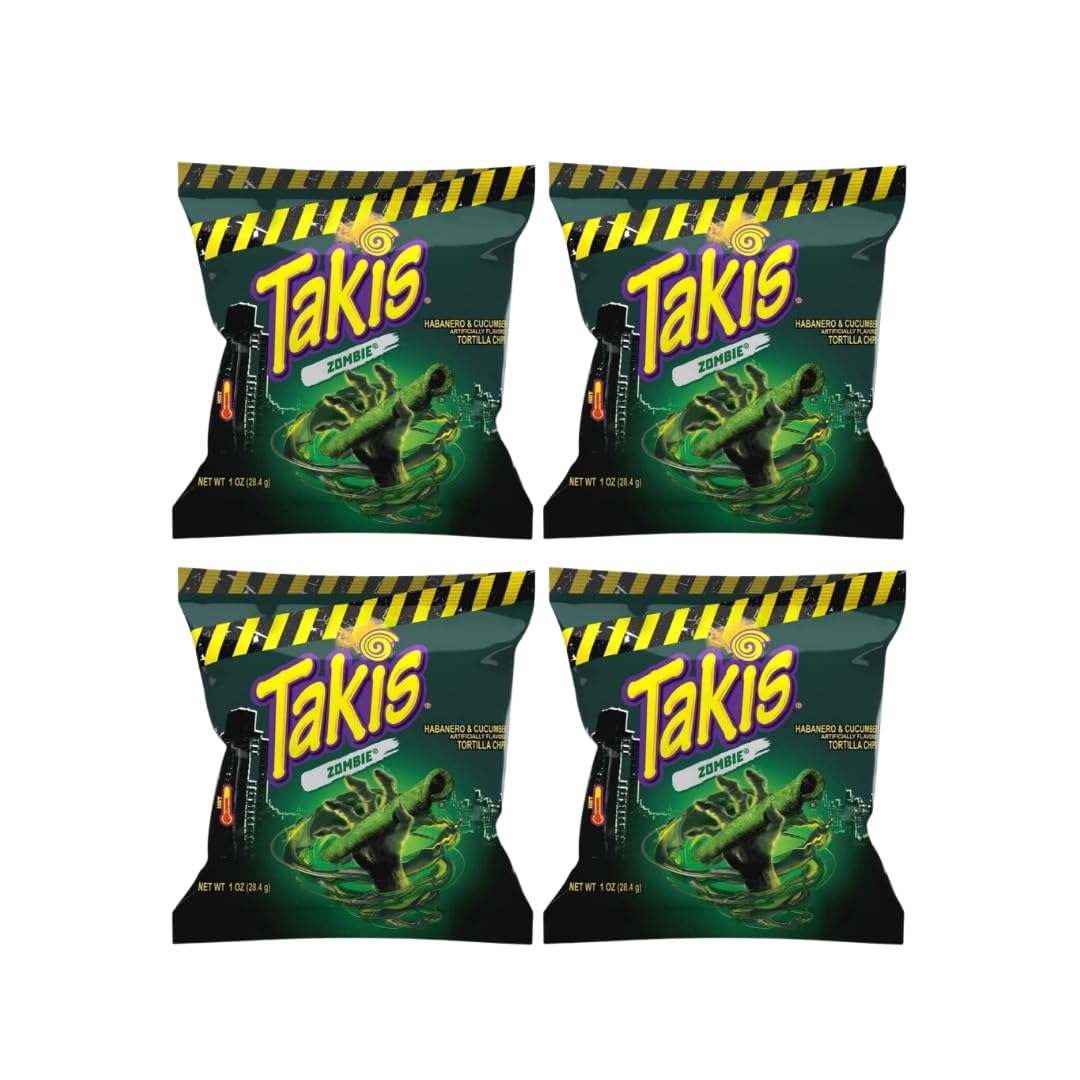 Takis Hero Pack of 4 packs of 28 g, TAKIS ZOMBIE special edition, chips Ingredients: corn flour (lime treatment), turmeric (color), skimmed milk, vegetable oil (palm and or soybean and or rapeseed oil), spices (salt, sugar, hydrolyzed corn protein, milk, maltodextrin, flavorings, whey (milk), tomato powder, onion powder, monosodium glutamate, gouda cheese (pasteurized milk, salt, cheese, enzymes), dextrose, color E110, lactic acid, citric acid, calcium silicate, silicon dioxide, silicon dioxide, disodium osinate, disodium guanylate). Allergens: Soy, Milk INGREDIENTS corn flour (lime-treated), vegetable oil (palm and or soybean and or rapeseed oil), spices [maltodextrin, salt, citric acid, dextrose, monosodium glutamate, sugar, onion powder, natural and artificial flavors, E 102, E 133, gum arabic, mannitol]Gift: Whether for a birthday, Christmas, or simply as a special gift for someone special, these Takis Riffle chips are a gift that will spark enthusiasm. They have a unique taste and are of the highest quality, making them a valuable treasure for any Takis chip fan. Absolutely limited: Stock in Germany is absolutely limited, so opt for it while our stocks last. Takis Riffle chips are an absolute must-have for all snack lovers with their unique taste unlike anything else on the German market. Contents: 4 x 28g Takis Zombie Special Edition. Takis Hero Pack de 4 paquets de 28 g, édition spéciale TAKIS ZOMBIE, chips Ingrédients : farine de maïs (traitement à la chaux), curcuma (colorant), lait écrémé, huile végétale (palme et ou huile de soja et ou de colza), épices (sel, sucre, protéines de maïs hydrolysées, lait, maltodextrine, arômes, lactosérum (lait), tomates. poudre, oignon. poudre, glutamate monosodique, fromage de gouda (lait pasteurisé, sel, fromage, enzymes), dextrose, colorant E110, acide lactique, acide citrique, silicate de calcium, dioxyde de silicium, dioxyde de silice, osinate disodique, guanylate disodique). Allergènes : soja, lait INGRÉDIENTS farine de maïs (traitée à la chaux), huile végétale (palme et ou huile de soja et ou de colza), épices [maltodextrine, sel, acide citrique, dextrose, glutamate monosodique, sucre, poudre d'oignon, arômes naturels et artificiels, E 102, E 133, gomme arabique, mannitol]Cadeau : que ce soit pour un anniversaire, Noël ou tout simplement comme cadeau spécial pour une personne spéciale, ces jetons Takis Riffle sont un cadeau qui suscitera l'enthousiasme. Elles ont un goût unique et de la plus haute qualité, ce qui en fait un trésor précieux pour tout fan de chips Takis. Absolument limité : le stock en Allemagne est absolument limité, alors optez pour autant que nos stocks soient épuisés. Les chips Takis Riffle sont un must absolu pour tous les amateurs de collations avec leur goût unique à rien sur le marché allemand. Contenu : 4 x 28 g Takis édition spéciale Zombie.