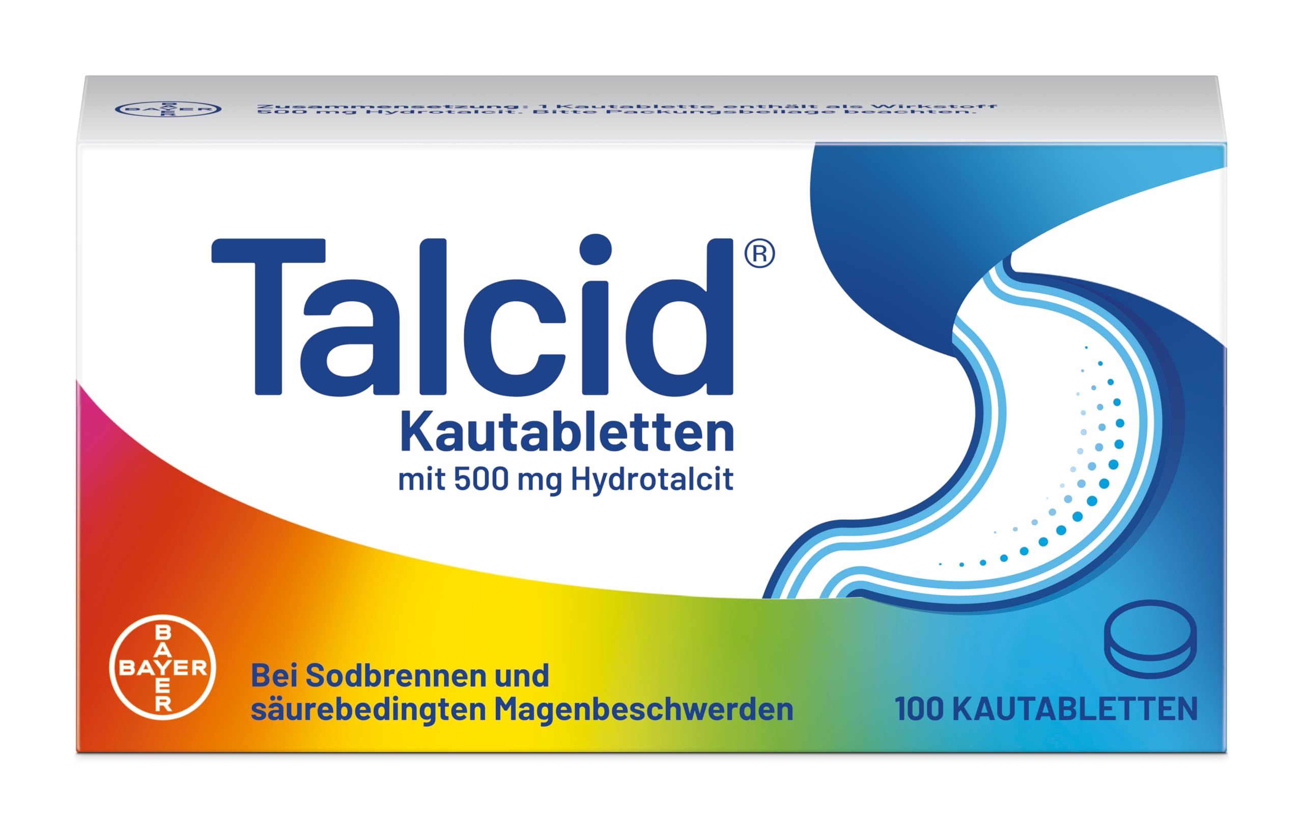 Talcid is used for symptomatic treatment of heartburn.This drug is the best -selling and mostly recommended means of heartburn.It works quickly for minutes, also against other acid -related stomach pain and against acid belching and stomach pressure by binding the stomach acid.Hydrotalcit is the proven active ingredient in Talcid.The chewing tablets each contain 500 milligrams.This not only quickly neutralized excess stomach acid, but also bound the harmful bile acid.For this purpose, the aggressive digestive enzyme Pepsin is inhibited, including by raising the gastro pH value.Once the optimal pH value of 4.5 has been reached, no active ingredient will be solved for the time being.Recommended dosage: Children from the age of 12 and adults take one or two chewing tablets between meals and before going to bed.The tablets can simply be chewed, an addition of water is not necessary.Depending on the need, Talcid can be taken up to several times a day.The chewing tablets are vegan, gluten -free and lactose -free.They also taste pleasantly like mild peppermint.Talcid chewing tablets are available in three pack sizes with 20, 50 and 100 pieces.Talcid products offer controlled acid neutralization The talcid active ingredient brings the pH in the stomach into the optimal area and neutralized excess stomach acid.Both Talcid Liquid and Talcid chewing tablets have proven proven in the event of heartburn.Complaints such as acid -related stomach complaints are quickly alleviated, the acidity in the stomach regulates and the gastric mucosa is protected. Ingredients ingredients Active ingredient per tablet: 500 mg hydrotalcid Instructions Chew one to two chewing tablets thoroughly if necessary and swallow them down - water is not necessary for this.Distributed over the day you can take up to twelve tablets between meals and before going to bed Warnings Mandatory information: Talcid chewing tablet ingredient: hydrotalcittalcid chewing tablets.Active ingredient: hydrotalcit.For the symptomatic treatment of diseases in which the stomach acid is to be bound: stomach and duodenum ulcers Heartburn and acid -related stomach complaints.Note: Contains menthol (peppermint aroma).Status: 11 2021.Bayer Vital GmbH, 51368 Leverkusen, Germany LEGAL NOTICE pharmacy Moretaste pleasant like mild peppermint.are well tolerated and the mostly sold means against heartburn.dissolve quickly and crumbs -free, do not stick to the teeth.regulate excess stomach acid and bring the pH in the stomach into the optimal area.Look quickly against heartburn (1).Talcid wird zur symptomatischen Behandlung von Sodbrennen angewendet. Dieses Medikament ist das meistverkaufte und meist empfohlene Mittel gegen Sodbrennen. Es wirkt minutenschnell, auch gegen andere säurebedingte Magenschmerzen sowie gegen saures Aufstoßen und Magendruck, indem es die Magensäure bindet. Hydrotalcit ist der bewährte Wirkstoff in Talcid. Die Kautabletten enthalten davon jeweils 500 Milligramm. Dadurch wird nicht nur überschüssige Magensäure schnell neutralisiert, sondern auch die schädliche Gallensäure gebunden. Dazu wird das aggressiv wirkende Verdauungsenzym Pepsin gehemmt, unter anderem durch die Anhebung des Magen-pH-Wertes. Ist der optimale pH-Wert von 4,5 erreicht, wird vorerst kein Wirkstoff mehr gelöst. Empfohlene Dosierung: Kinder ab 12 Jahren und Erwachsenen nehmen je ein bis zwei Kautabletten zwischen den Mahlzeiten und vor dem Schlafengehen ein. Die Tabletten können einfach zerkaut werden, eine Zugabe von Wasser ist nicht nötig. Je nach Bedarf kann Talcid bis zu mehrmals täglich eingenommen werden. Die Kautabletten sind vegan, glutenfrei und laktosefrei. Zudem schmecken sie angenehm nach milder Pfefferminze. Talcid Kautabletten sind in drei Packungsgrößen mit 20, 50 und 100 Stück erhältlich. Talcid Produkte bieten eine kontrollierte Säureneutralisation Der Talcid-Wirkstoff bringt den pH-Wert im Magen in den optimalen Bereich und neutralisiert überschüssige Magensäure. Sowohl Talcid Liquid als auch Talcid Kautabletten leistet bewährt Abhilfe bei Sodbrennen. Beschwerden wie säurebedingte Magenbeschwerden werden schnell gelindert, der Säuregehalt im Magen reguliert und die Magenschleimhaut geschützt. INHALTSSTOFFE ZUTATEN Wirkstoff je Tablette: 500 mg Hydrotalcid GEBRAUCHSANWEISUNG Zerkauen Sie bei Bedarf ein bis zwei Kautabletten gründlich und schlucken Sie sie herunter – Wasser ist dafür nicht notwendig. Über den Tag verteilt können Sie zwischen den Mahlzeiten und vor dem Schlafengehen bis zu zwölf Tabletten einnehmen WARNHINWEISE Pflichtangaben:Talcid KautablettenWirkstoff: HydrotalcitTalcid Kautabletten. Wirkstoff: Hydrotalcit. Zur symptomatischen Behandlung von Erkrankungen, bei denen die Magensäure gebunden werden soll: Magen- und Zwölffingerdarmgeschwüre Sodbrennen und säurebedingte Magenbeschwerden. Hinweis: Enthält Menthol (Pfefferminz-Aroma). Stand: 11 2021. Bayer Vital GmbH, 51368 Leverkusen, Deutschland RECHTLICHE HINWEISE apothekenpflichtig Mehrschmecken angenehm nach milder Pfefferminze. sind gut verträglich und das meist meistverkaufte Mittel gegen Sodbrennen. lösen sich schnell und krümelfrei auf, kleben nicht an den Zähnen. regulieren überschüssige Magensäure und bringen den pH-Wert im Magen in den optimalen Bereich. wirken schnell gegen Sodbrennen(1).Talcid Kautabletten, 100 St. Tabletten