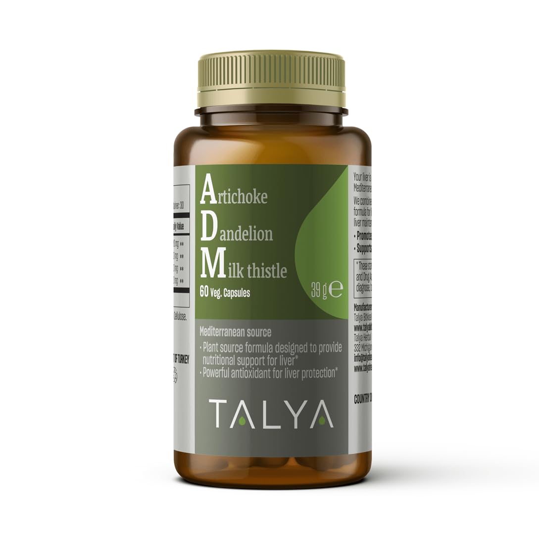 Talya ADM combines three time-honored botanicals Milk Thistle standardized to silymarin, Artichoke, and Dandelion to deliver comprehensive support for healthy liver function and gentle detox balance. Milk Thistle Silybum marianum is rich in silymarin, a natural antioxidant complex studied for its role in protecting liver cells and promoting normal liver enzyme activity. For centuries, it has been used by traditional herbalists in the Mediterranean region for liver and digestive health. Our special blend also features Artichoke leaf and Dandelion root, two botanicals traditionally paired with milk thistle to support bile flow, digestion, and overall cleansing pathways. At Talya Herbal, we source the highest quality Mediterranean plants, carefully processed to preserve their active constituents. Our vegan, Non-GMO capsules are crafted without harsh chemicals, ensuring a clean and natural supplement for daily wellness. Suggested Use: Take 2 capsules daily with water, preferably with meals.