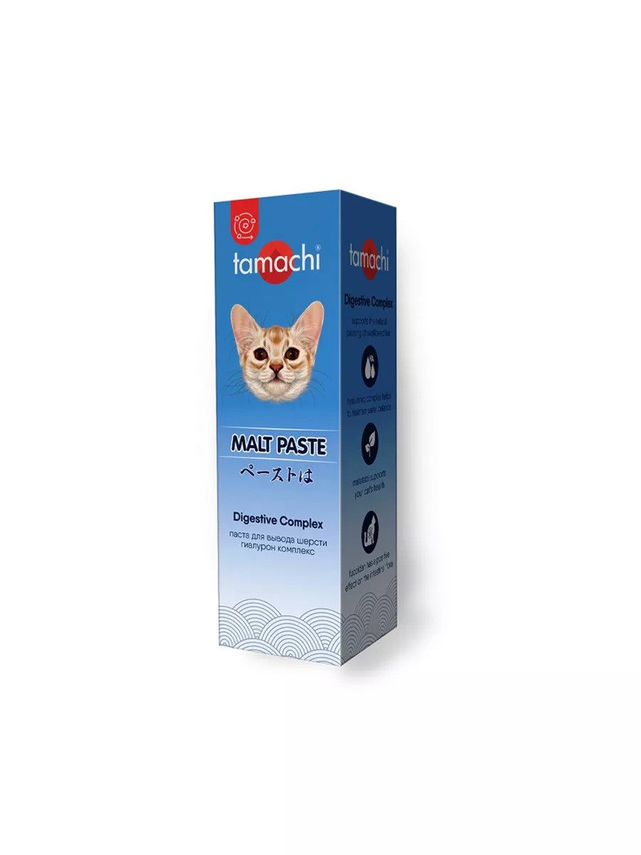 Тамачи Мальт-пасту применяют для вывода волосяных комков из желудочно-кишечного тракта, профилактики их образования и избавления от рвоты и запоров. Уникальная формула активных компонентов: гиалуроновый комплекс способствует поддержанию нормального водного баланса в организме, является частью внеклеточного матрикса, обеспечивающего механическую поддержку клеток и транспорта химических веществ, мататаби улучшает аппетит, оказывает общеукрепляющее и болеутоляющее действие, фукоидан оказывает позитивное воздействие на кишечную флору и нормализуют функции желудочно-кишечного тракта. Состав: Ячменно-солодовый экстракт неохмеленный, масло кукурузное рафинированное, отруби пшеничные, концентрат лактулозы, изолят соевого белка, вода питьевая, сухое цельное молоко, сорбат калия, гиалуронат натрия низкомолекулярный, порошок мататаби, фукоидан водно-пропиленгликолевый экстракт, бензоат натрия. Способ применения: Применяют кошкам, котятам, хорькам для вывода волосяных комков из желудочно-кишечного тракта и профилактики их образования. Кошкам и котятам массой до 2 кг — 2 см (1 г), массой более 2 кг — 5 см (2,5 г) пасты ежедневно. Хорькам во время линьки два раза в неделю по 2 см (1 г). При необходимости порция может быть удвоена. Пасту рекомендуется давать до еды в чистом виде непосредственно из тюбика или перемешать ее с кормом. У чувствительных животных в очень редких случаях возможны аллергические реакции. В этих случаях применение пасты прекращают. Условия хранения: Хранят средство в закрытой упаковке производителя, в защищённом от прямых солнечных лучей месте, отдельно от продуктов питания и кормов при температуре от 2 °C до 25 °C. Хранить в недоступном для детей и животных месте. Срок годности 2 года.