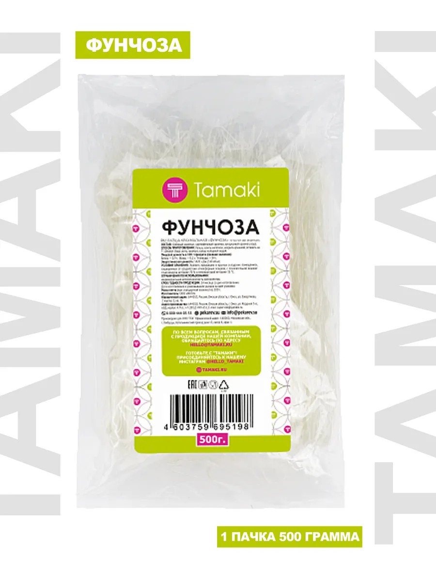 Фунчоза - лапша с плотной текстурой и цельными нитями, которая при приготовлении остается пышной, не распадается на части и не превращается в комок. Фунчоза готовится из отборного сырья, производится на высокотехнологичном оборудовании под тщательным наблюдением специалистов.Лапша выиграла большинство слепых дегустаций среди шеф-поваров Академии суши "Тамаки". Фунчоза считается низкокалорийным продуктом, идеально подходит для приготовления пп-блюд. Ее подают с жареным мясом, рыбой, яйцами, грибами, свежими, тушеными и жареными овощами, добавляют в суп и корейский салат, в спринг-роллы. Лучше всего фунчоза сочетается с кисло-сладкими соусами и острыми пряностями. Состав: Бобовый крахмал, картофельный крахмал, кукурузный крахмал, вода .