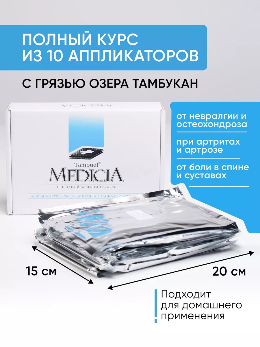 Tambukan Lake mud, with its natural composition intact, is packaged in permeable bags. The set includes 10 disposable applicators measuring 15 cm x 20 cm, or a full course of treatment. We recommend using them with a heating pad, such as the Tambuel Thermocompress 300, which is sold separately. Scientific research has proven that Tambukan mud exhibits its best anti-inflammatory, decongestant, analgesic, immunomodulatory, antioxidant, detoxifying, and other effects when used in this manner. Silt sulfide mud contains 60% amino acids and proteins, and also contains free fatty acids, valuable phospholipids, carotenoids, vitamin E, B vitamins, ascorbic acid, and macro- and microelements, including calcium, magnesium, copper, iron, zinc, and selenium. Therefore, it is significantly superior to Saki mud and Dead Sea mud. This environmentally friendly product is an excellent alternative to osteochondrosis ointments for joints and back pain. Its primary indications include chronic musculoskeletal conditions (arthrosis, arthritis, osteochondrosis, etc.) and nervous system disorders (neuralgia, radiculitis, etc.), peripheral vascular diseases (varicose veins, thrombophlebitis, etc.), gastrointestinal disorders (stomach, liver, biliary tract, and gallbladder disorders, etc.), metabolic disorders (gout, obesity, etc.), dental and skin conditions (psoriasis, dry eczema, dermatoses, etc.), and reproductive system disorders. Contraindications apply. Lake Tambukan mud is actively used in more than 120 sanatoriums and resorts in the Caucasian Mineral Waters region, and our applicators allow for mud therapy at home. To do this, warm 1 or 2 applicators to room temperature, remove them from the packaging (film), and place them under a compress heated in a thermostat or water bath to 35-55°C. Then wrap the affected area in plastic wrap and cover with a napkin and blanket. It's best to perform the procedure for 15-30 minutes every 1-2 days.
