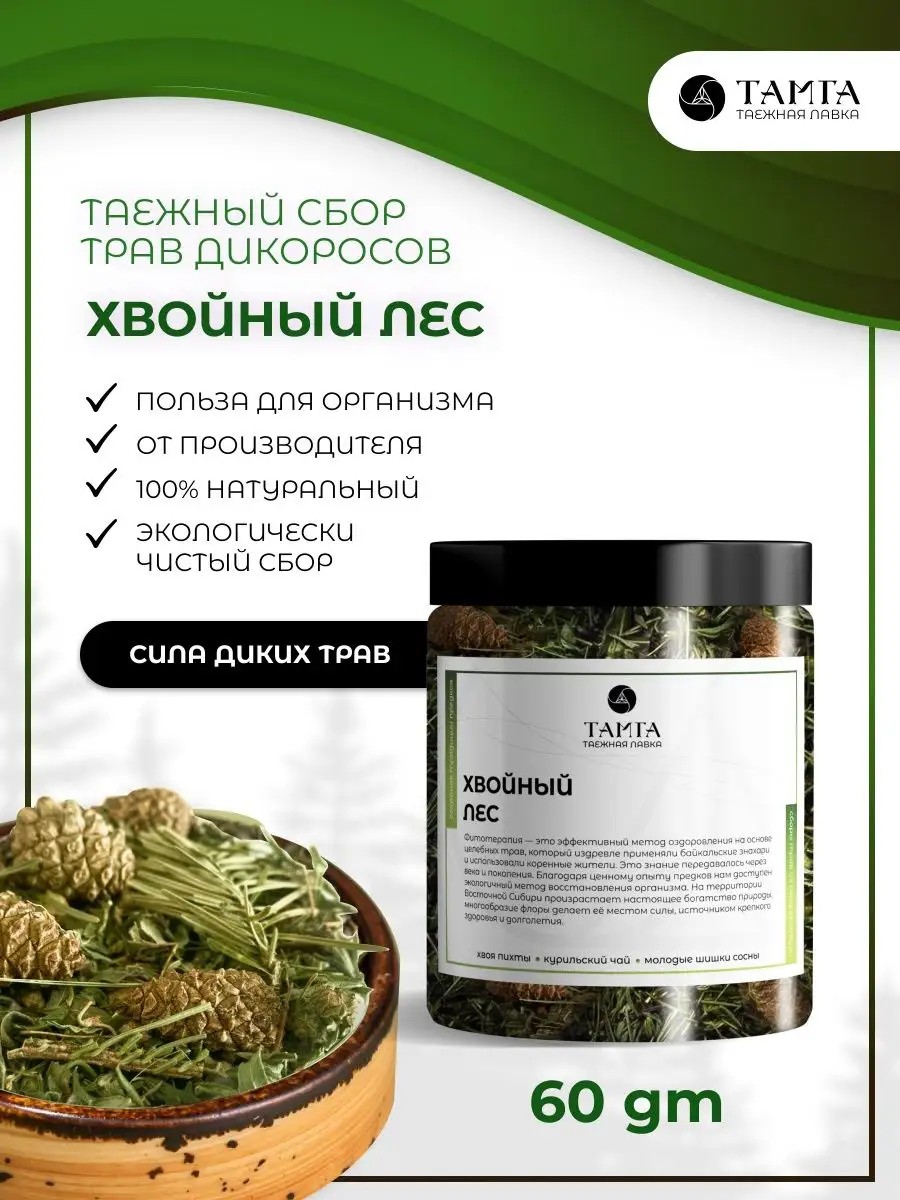 Натуральный травяной сбор "Хвойный лес" - источник фитонцидов и витамина С. Сбор восстанавливает иммунитет, обладает бактерицидным, противовирусным и противовоспалительным свойствами. Регулярное употребление сбора “Хвойный лес” укрепит организм и поддержит работу лёгочной системы. Аромат свежей хвои и молодых сосновых шишек окунет вас в атмосферу сибирской тайги. Реликтовая флора уже сотни лет помогает народам Сибири иметь крепкое здоровье, сильный дух и жизненную энергию. Экологически чистая зона обитания, бережный сбор и правильная сушка помогли сохранить максимальную пользу сбора для Вашего здоровья.