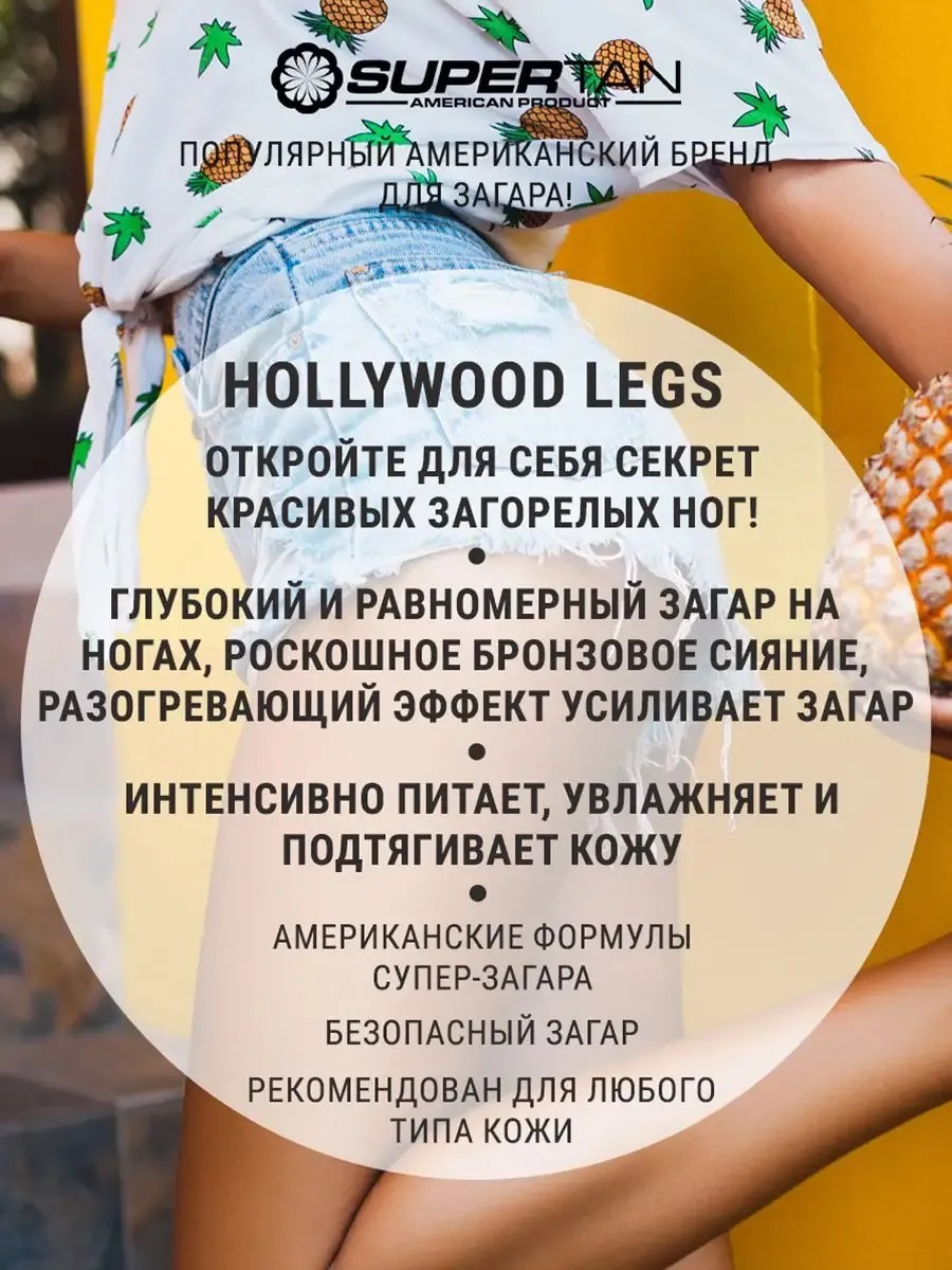 Крем для загара в солярии SuperTan Hollywood Legs – крем-ускоритель для загара ног с бронзаторами и разогревающим эффектом. Этот крем специально разработан для загара ног. Откройте для себя секрет красивых загорелых ног! Крем для солярия с брозаторами обеспечивает эффект темного загара уже после первого сеанса загара. Комбинация активных бронзирующих ингредиентов, таких как DHA, экстракт грецкого ореха и тирозина, обеспечивает коже естественный коричневый оттенок загара. Формула крема для солярия с бронзерами обогащена «термоэффектом», благодаря которому ноги загорают быстрее. Действие крема дополняется маслом макадамии и витамином Е, которые увлажняют и смягчают кожу. Крем также имеет приятный аромат и быстро впитывается, не оставляя следов на одежде. Anti-age формула с коллагеном и соком листьев алоэ повышает тонус и эластичность кожных покровов, предотвращают преждевременное фотостарение кожи и делают загар более стойким. Крем для загара SuperTan Hollywood Legs поможет вам достичь более глубокого и равномерного загара на ногах, придавая им красивый и сияющий вид. Это идеальный крем для тех, кто хочет получить красивый загар, но при этом сохранить здоровье кожи. Крем предназначен для загара в солярии и на солнце. Легкими круговыми движениями равномерно нанесите крем на кожу перед сеансом загара в солярии или под солнцем. Крем для солярия, средства для загара, для ног, быстрый загар, стойкий загар, крем для солярия с коллагеном, крем для чувствительной кожи, без парабенов, без аллергенов, без жирного блеска, с матирующим эффектом, ускоритель загара, безопасный загар, увлажнение кожи, питание кожи АРОМАТ: кофе с молоком.