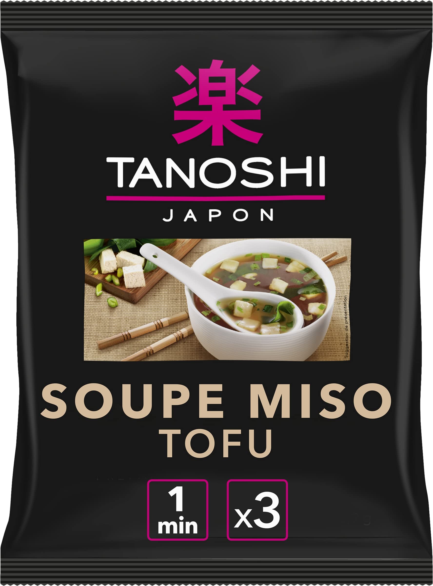 : The Tanoshi brand invites you to discover Japan and Korea through culinary products emblematic of these two countries' cultures. Combining authenticity, high quality, and refined flavors, Tanoshi ingredients and sauces are crafted using traditional methods, without GMOs or Bisphenol A. The company has also removed 13 controversial additives from its recipes, such as added MSG, and supports the production of sustainable palm oil (Green Palm). Committed to offering you the most authentic products possible, the Tanoshi team regularly visits its Asian production sites to work closely with its suppliers. This is how they provide you with products that will transport you (tastefully!) to the heart of Asia. Original flavors directly inspired by Izakaya (Japanese pubs) and street food stalls (Yatai in Japan or Pojangmacha in Korea), exotic ingredients, and typical sauces will delight your taste buds. Noodle cups, sushi kits, rice, ramen, sauces—you'll find plenty of ways to treat yourself within the Tanoshi range. A fan of Japanese cuisine? Choose the pink Tanoshi products dedicated to this culture. More into Korean food? Then the yellow Tanoshi products are for you! Miso soup is a staple of Japanese cuisine. Made with fermented soybean paste and flavored with seaweed and vegetables, it is traditionally eaten at the beginning of a meal. With its miso soup recipes rich in Asian flavors, Tanoshi invites you to discover the pleasure of Japanese-style soup. One Tanoshi soup pack contains 3 sachets of miso paste and 3 sachets of ingredients to make 3 individual servings of miso soup. Ingredients: MISO PASTE: SOYBEAN paste 66.8 (SOYBEAN, water, rice, salt, alcohol), water, alcohol, salt, flavor enhancers: disodium inosinate, disodium guanylate yeast extract. P.when('A').execute(function(A) { A.on('a:expander:toggle_description:toggle:collapse', function(data) { window.scroll(0, data.expander. expander[0].offsetTop-100) }) }) Instructions: Dilute one sachet of miso paste in 160 ml of boiling water, then stir. Add the sachet of tofu and seaweed, stirring, then let it sit for 1 minute before enjoying. See moreTHE TANOSHI BRAND: Tanoshi takes you on a delightful journey to Asia with authentic, flavorful, and refined products dedicated to Japanese cuisine (pink products) and Korean cuisine (yellow products). HOW TO PREPARE YOUR BOWL OF MISO SOUP: Dissolve one packet of miso paste in 160 ml of boiling water, then stir. Add the packet of tofu and seaweed, stirring well, then let it sit for 1 minute before enjoying. THE RECIPE FOR THIS SOUP: Made without added MSG, this Tanoshi soup is prepared with soy-based miso paste, tofu (a paste made from curdled soy milk), wakame seaweed, and green onions. WHAT IS MISO?: A staple food in Japan, miso soup is made from fermented soybean paste diluted in water, giving it a clear texture on top and a velvety consistency at the bottom. TANOSHI TOFU MISO SOUP: Ideal for warming you up and ready in 1 minute, Tanoshi miso soup takes you on a journey to the Orient with this traditional Japanese dish made from soybeans, which is eaten at the beginning of a meal.Description du produit La marque Tanoshi vous fait découvrir le Japon et la Corée au travers de produits culinaires emblématiques des cultures de ces deux pays. Alliant authenticité, haute qualité et saveurs raffinées, les ingrédients et sauces Tanoshi sont fabriqués selon un savoir-faire traditionnel, sans OGM ni Bisphénol A. L'entreprise a également supprimé 13 additifs controversés de ses recettes, comme le glutamate ajouté, et soutient la production d'huile de palme durable (Green palme). Ayant à cœur de vous proposer les produits les plus authentiques possible, l'équipe Tanoshi se rend régulièrement sur ses sites de production asiatiques afin de travailler en étroite collaboration avec ses fournisseurs. C'est de cette manière qu'elle vous donne accès à des produits capables de vous faire voyager (gustativement !) au cœur de l'Asie. Saveurs originales directement inspirées des Izakaya (bar japonais) et stands de street food (les Yatai au Japon ou les Pojangmacha en Corée), ingrédients exotiques et sauces typiques éveilleront vos papilles avec bonheur. Cup de nouilles, kits sushis, riz, ramen, sauces, vous trouverez de nombreux moyens de vous faire plaisir au sein de la gamme Tanoshi. Fan de cuisine japonaise ? Choisissez les produits Tanoshi roses dédiés à cette culture. Plutôt branché cuisine coréenne ? Alors ce sont les produits Tanoshi jaunes qu'il vous faut ! La soupe miso est un mets incontournable de l'alimentation japonaise. Préparée à base de pâte de soja fermenté et agrémentée d'algues et légumes, elle est traditionnellement consommée en début de repas. Avec ses recettes de soupe miso riches en saveurs asiatiques, Tanoshi vous fait découvrir le plaisir du potage à la japonaise. Un paquet de soupe Tanoshi contient 3 sachets de pâte miso et 3 sachets d'ingrédients pour réaliser 3 soupes miso individuelles. Ingrédients Ingrédients: PÂTE DE MISO: pâte de SOJA 66,8 (SOJA, eau, riz, sel, alcool), eau, alcool, sel, exhausteurs de goût: inosi- nate disodique, guanylate disodique extrait de levure. P.when('A').execute(function(A) { A.on('a:expander:toggle_description:toggle:collapse', function(data) { window.scroll(0, data.expander. expander[0].offsetTop-100) }) }) Mode d'emploi Diluez un sachet de pâte Miso dans 160 ml d'eau bouillante, puis remuez. Ajoutez le sachet de tofu et d'algues en remuant, puis laissez reposer 1 minute avant de déguster. Voir plusLA MARQUE TANOSHI : Tanoshi vous fait voyager en Asie avec délice, au travers de produits authentiques, savoureux et raffinés, dédiés à la gastronomie japonaise (produits roses) et à la cuisine coréenne (produits jaunes). COMMENT PRÉPARER VOTRE BOL DE SOUPE MISO ? : Diluez un sachet de pâte Miso dans 160 ml d'eau bouillante, puis remuez. Ajoutez le sachet de tofu et d'algues en remuant, puis laissez