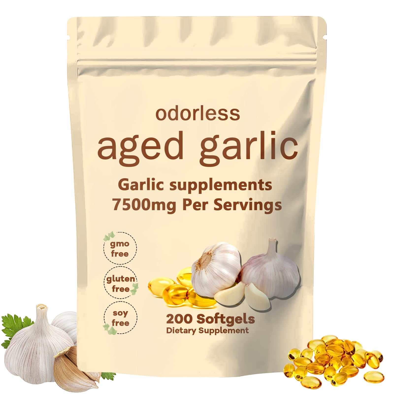 Vegan-Friendly Cruelty-Free:Plant-based capsule material and ethical sourcing make this supplement ideal for conscious consumers prioritizing sustainability. Convenient Daily Dose:Softgel format eliminates messy capsules or powders, with 200 servings in one bottle for 6-month supply and easy on-the-go use. Enjoy premium garlic that is enhanced with our aging process. Contained in dry and low temperatures over a long period of time to remove its pungent odor and any stomach irritating compounds . Clean Safe Formula:sensitive individuals, with no artificial additives or synthetic fillers. Daily Immune Protection:7500mg of aged garlic extract per serving delivers concentrated allicin to boost immune function and combat seasonal stressors without garlic odor.