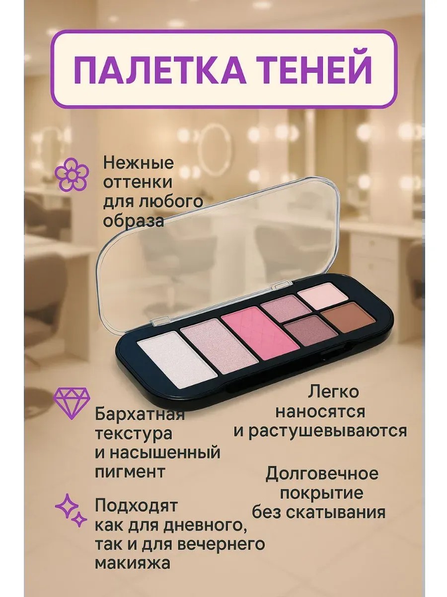 Тени для век палетка – это набор сияющих и матовых оттенков, где преобладают светлые и розовые тона, идеально подходящие для создания женственного и свежего макияжа. В палетке представлены тени для век палетка профессиональные, которые позволяют легко варьировать образы – от нежных дневных до выразительных вечерних. Компактный формат делает её удобной, словно тени для век маленькая палетка, которую можно носить с собой.