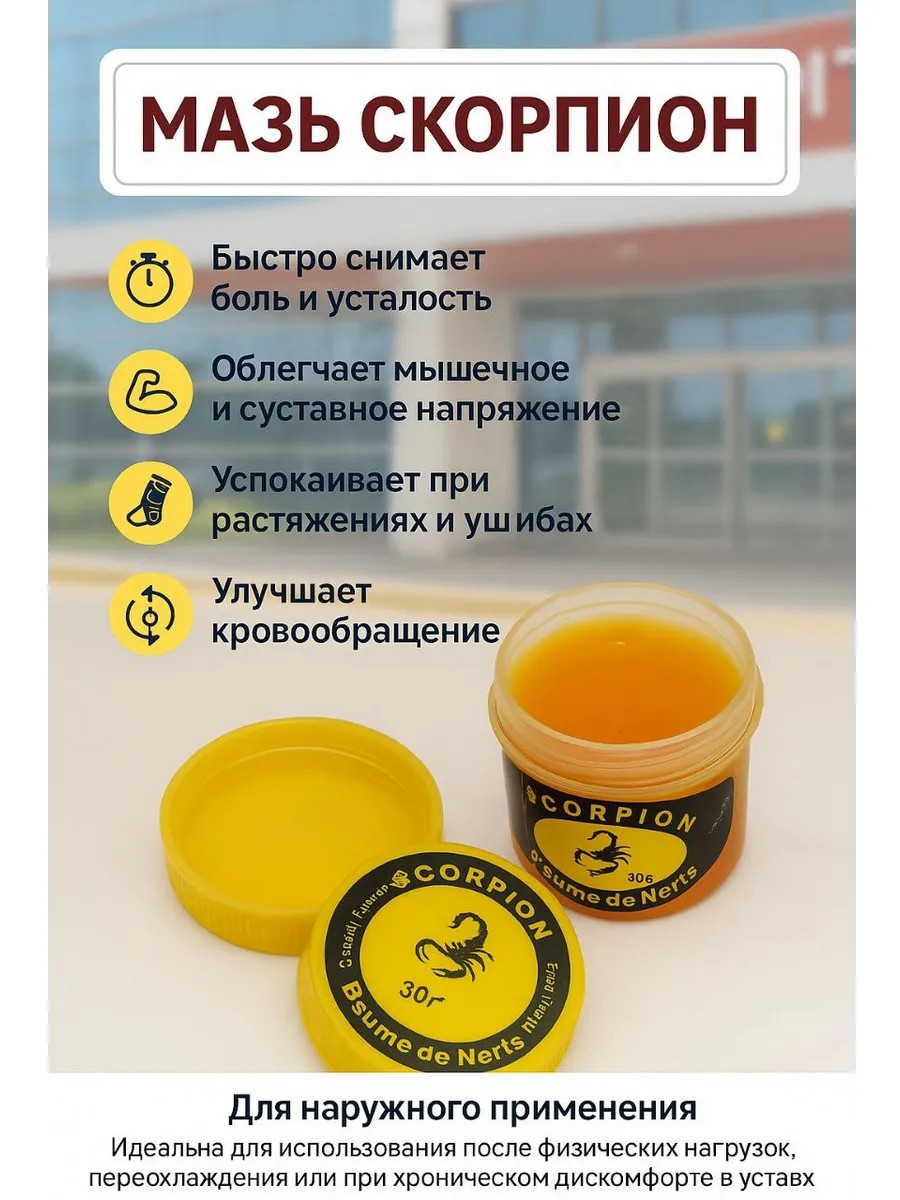 Бальзам с ядом скорпиона — это уникальное средство, созданное по традиционным тайским рецептам, которое активно используется для снятия боли и восстановления после нагрузок. Продукт работает как обезболивающий бальзам для суставов и мышц, помогая при воспалениях, болях различного происхождения и хронических проблемах опорно-двигательного аппарата.