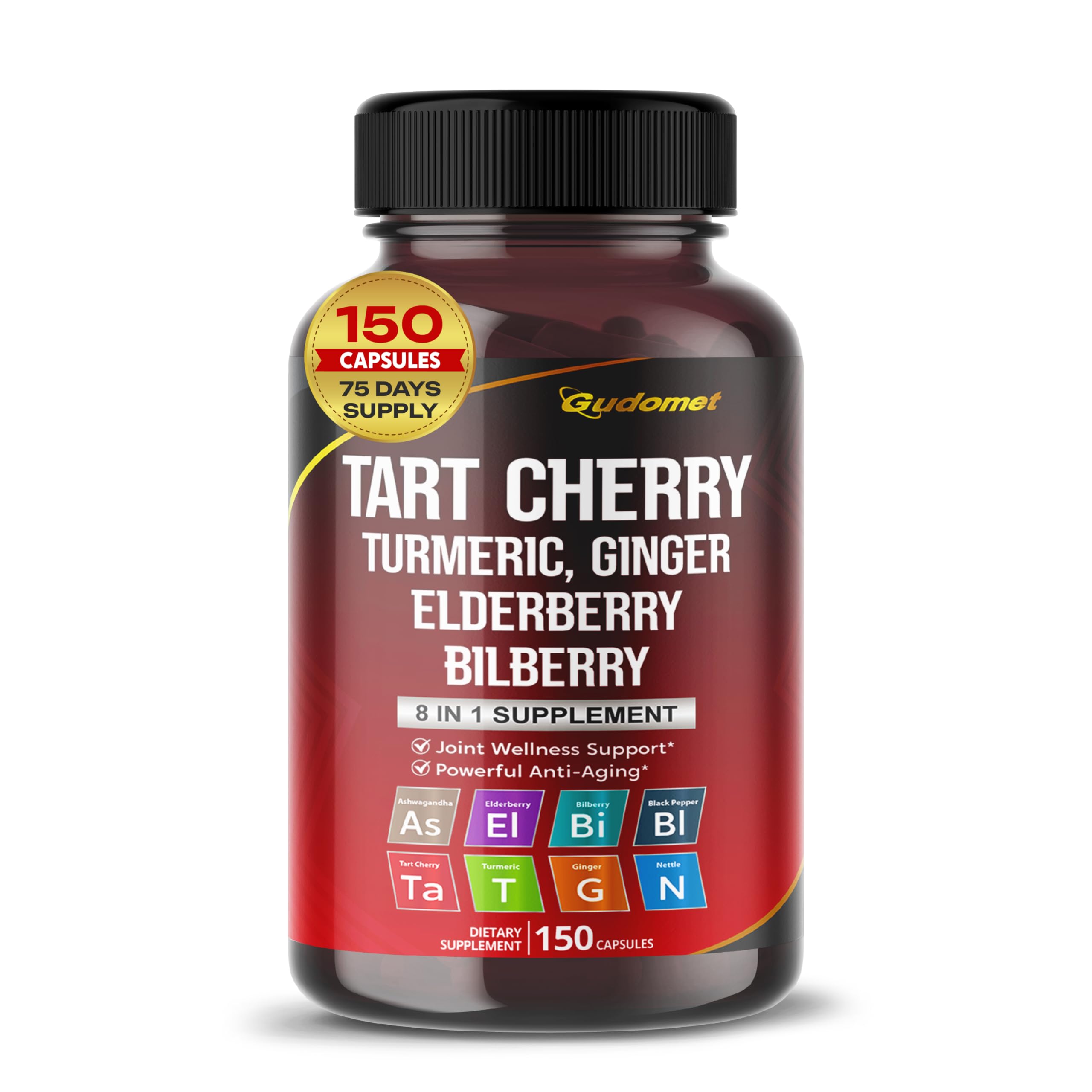 Your Wellness Comes First: Gudomet Supplements emphasize superior quality, undergoing rigorous testing at ISO 17025 certified labs to ensure purity and potency. Reliable Ingredients: Gudomet meticulously sources each ingredient from trusted suppliers, ensuring they are entirely natural, non-GMO, and free from gluten, sugar, and chemicals. 100 Pure Natural Ingredients: Tart Cherry, Turmeric, Ginger, Stinging Nettle, Ashwagandha, Elderberry, Bilberry, and Black Pepper. Explore a Variety of Wellness Benefits: Gudomet's Tart Cherry Supplement combines potent ingredients to support joint mobility, promote healthy aging, and enhance restful sleep. 5-Month Supply in One Bottle: Each bottle contains 150 capsules, providing a five-month supply. Simply take one capsule a day to experience its potent wellness benefits.
