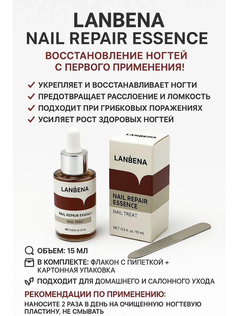 LANBENA serum effectively restores the nail plate, strengthens nails, gives them a healthy shine and accelerates growth.