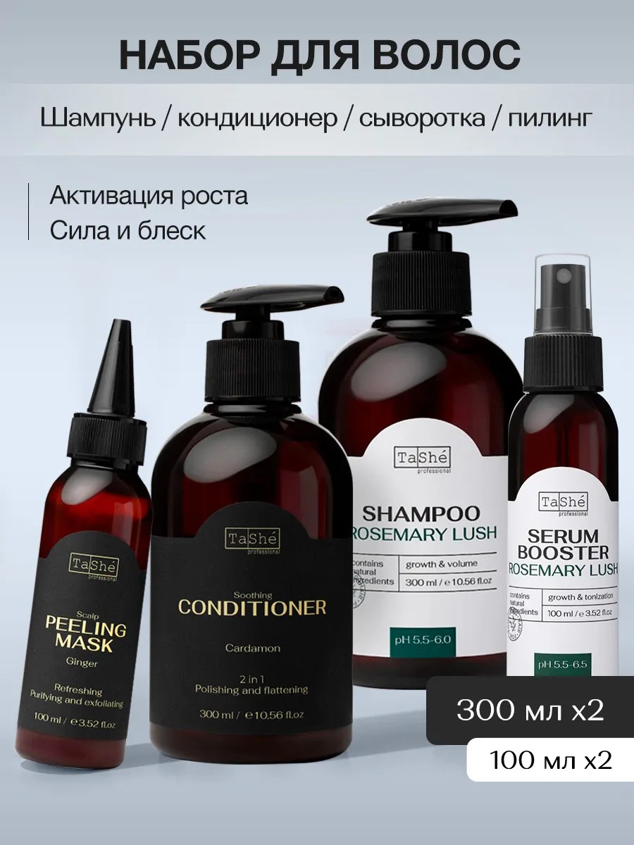 Комплексный уход за волосами с набором, включающим шампунь, бальзам-кондиционер, сыворотку-бустер и пилинг для кожи головы. Подходит для улучшения структуры волос, активации их роста и ухода за кожей головы.