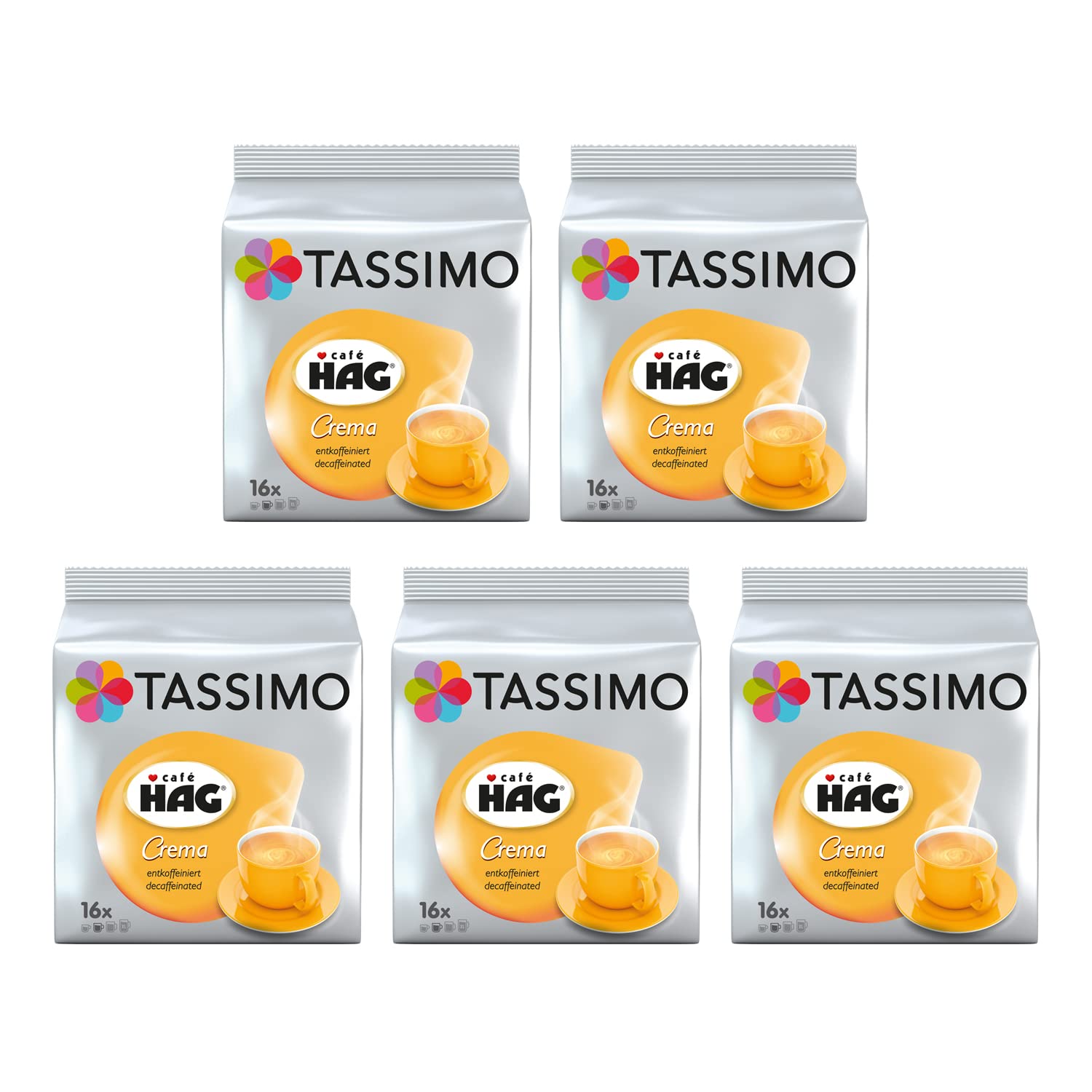 Easy to prepare: simply insert the capsule and brew. Fresh brew with long shelf life – plenty of time to enjoy. Everyone's favorite drinks at your fingertips. There's no compromise on taste with this quality decaffeinated coffee. CAFE HAG is ideal for any time of day. Enjoy the perfect moment with our Tassimo Cafe HAG Crema decaffeinated coffee pods.Facile à préparer : il suffit de mettre la capsule et d'infusion. Bouillon frais avec de longues dates de péremption - Beaucoup de temps pour boire. Les boissons préférées de tout le monde à portée de main. Il n'y a pas de compromis sur le goût avec ce café décaféiné de qualité. CAFÉ HAG est idéal pour tout moment de la journée. Profitez du moment parfait avec nos dosettes de café décaféiné Tassimo Cafe HAG Crema.TASSIMO Cafe HAG Crema Decaffeinated Café Capsules T-Discs Paquet de 5, 80 Boissons