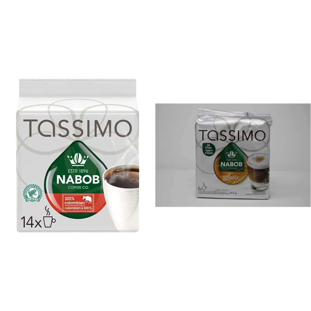 Tassimo Nabob 100 Colombian Coffee Single Serve T-Discs, 110g Tassimo Nabob 100 Colombian Coffee T-Discs deliver Nabob's locally-sourced coffee beans in a convenient format. Made with 100 Arabica beans, these T-Discs create a satisfying, aromatic cup of coffee every time. For an unmatched aromatic finish, brew a cup of this bright, citrusy medium roast and indulge in the exceptionally rich flavour expertly brought out by our Roastmaster. Nabob 100 Colombian coffee is Rainforest Alliance Certified, demonstrating Nabob's commitment to both the environment and great coffee. Ever since our beginnings back in 1896, we at the Nabob Coffee Co. continue to fuel our passion for coffee, our communities and the environment. Tassimo Nabob 100 Colombian T-Discs are compatible with all Tassimo brewing systems. Tassimo Nabob Latte Coffee Single Serve T-Discs, 263g With Tassimo Nabob Latte Coffee T-Discs you can now enjoy an authentic café quality latte at home. By combining dark, intense tasting Nabob espresso with the rich, velvety texture of creamy steamed milk, this delicious latte can be made in your Tassimo brewing system in just two steps. Simply insert the espresso T-Disc, brew, and then top off the fresh espresso with the steamed milk T-Disc! Ever since our beginnings back in 1896, we at the Nabob Coffee Co. continue to fuel our passion for coffee, our communities and the environment. Tassimo Nabob Latte Coffee T-Discs are compatible in all Tassimo brewing systems.Product 2: Enjoy an authentic café quality latte at home. Product 2: T-Discs are compatible with Tassimo brewers. Product 2: Makes 9 fl oz 260 ml hot latte. Product 2: One 263G bag of Tassimo Nabob Latte Coffee T-Discs (8 total latte drinks). Product 1: Nabob Coffee is Rainforest Alliance Certified. Product 1: Medium roast coffee. Product 1: Each T-Disc makes one 8 fl oz 236 ml cup of coffee. Product 1: One 110G bag of Tassimo Nabob 100 Colombian Coffee T-Discs (14 t-discs).