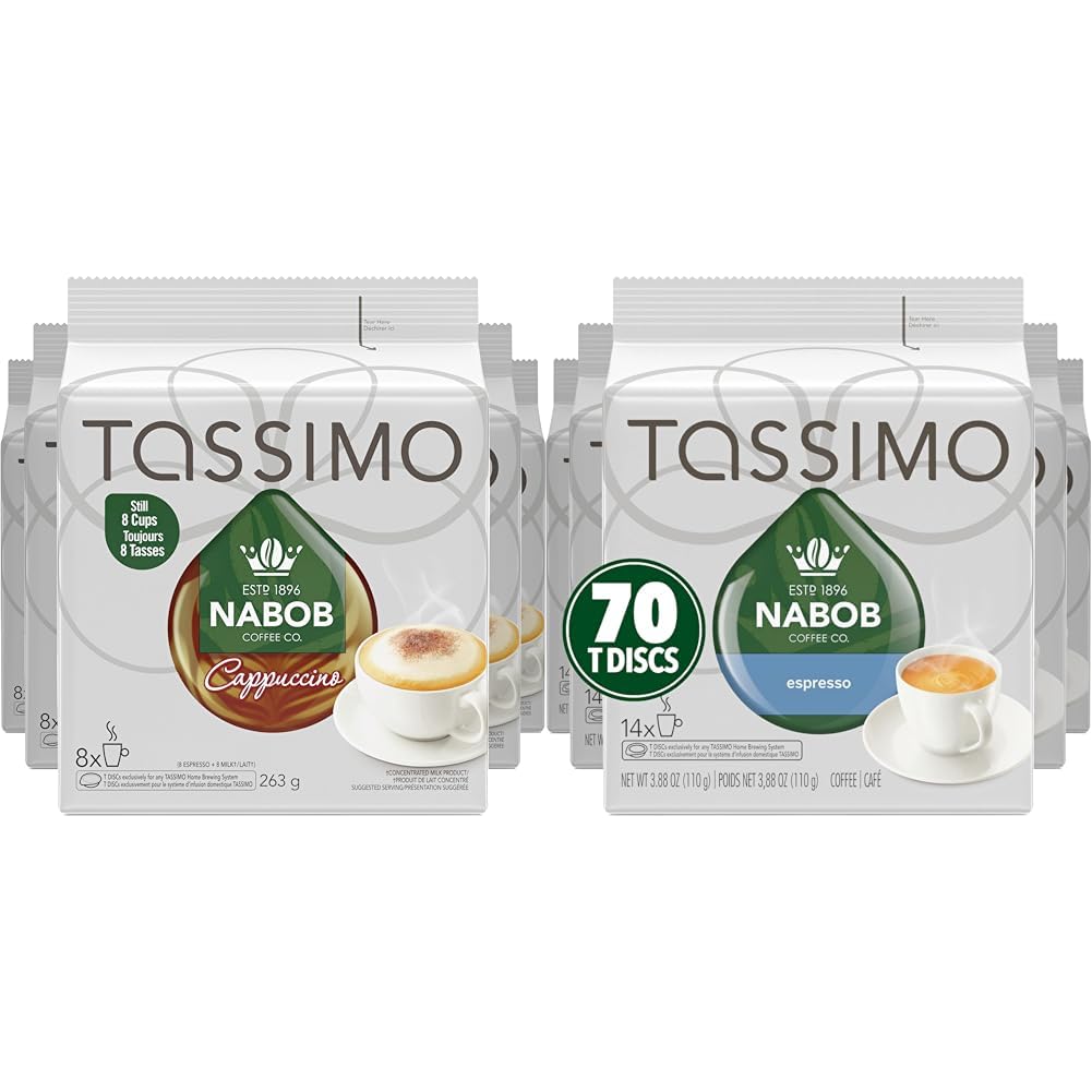Tassimo Nabob Cappuccino Coffee Single Serve T-Discs, 263g (5 Boxes of 8 T-Discs) With Tassimo Nabob Cappuccino T-Discs you can now enjoy an authentic café quality cappuccino at home. So, put your day on hold and lose yourself in a delicious Nabob Cappuccino. This indulgent beverage features a heavenly combination of intensely dark espresso and hot foamed milk. This great tasting cappuccino can be made in your Tassimo brewing system in just two steps. Simply insert the espresso T-Disc, brew, and then top off the fresh espresso with the foamed milk T-Disc! Ever since our beginnings back in 1896, we at the Nabob Coffee Co. continue to fuel our passion for coffee, our communities and the environment. Tassimo Nabob Cappuccino T-Discs are compatible with all Tassimo brewing systems. Tassimo Nabob Espresso Single Serve T-Discs, 110g (5 Boxes of 14 T-Discs) With Tassimo Nabob Espresso Coffee T-Discs you can now enjoy an authentic café quality espresso at home. Nabob Espresso is a classic espresso with an intense, velvety flavour and a dark, lingering finish sealed with a smooth layer of crema. Tassimo Nabob Espresso T-Discs are Rainforest Alliance Certified, demonstrating Nabob's commitment to both the environment and great coffee. Ever since our beginnings back in 1896, we at the Nabob Coffee Co. continue to fuel our passion for coffee, our communities and the environment. Tassimo Nabob Espresso T-Discs are compatible with all Tassimo brewing systems.Product 2: Nabob Coffee is Rainforest Certified. Product 2: T-Discs are compatible with Tassimo brewers. Product 2: Made with 100 Arabica beans. Product 2: Five 110G bags of Tassimo Nabob Espresso T-Discs (70 t-discs). Product 1: T-Discs are compatible with Tassimo brewers. Product 1: Makes 8 fl oz 240 mL cappuccino drink. Product 1: 40 milk t-discs and 40 espresso t-discs (8 total cappuccinos). Product 1: Five 263G bags of Tassimo Nabob Cappuccino Coffee T-Discs.
