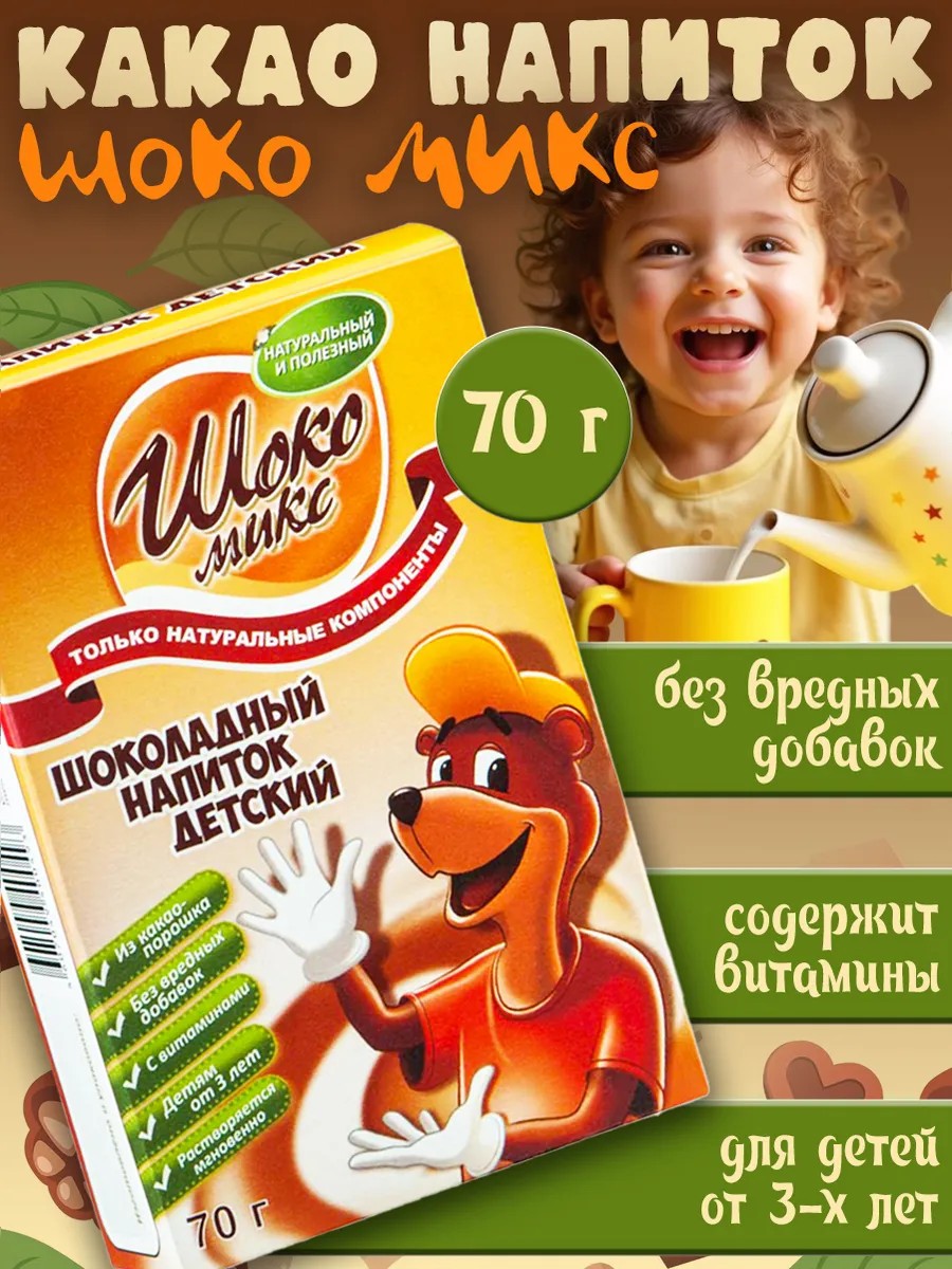 Вкусный и натуральный какао-напиток не содержит искусственных красителей, ароматизаторов, эмульгаторов и загустителей. Комплекс витаминов в составе какао “Шокомикс” способствует усвоению кальция, нормальному функционированию иммунной системы, росту и развитию детского организма.