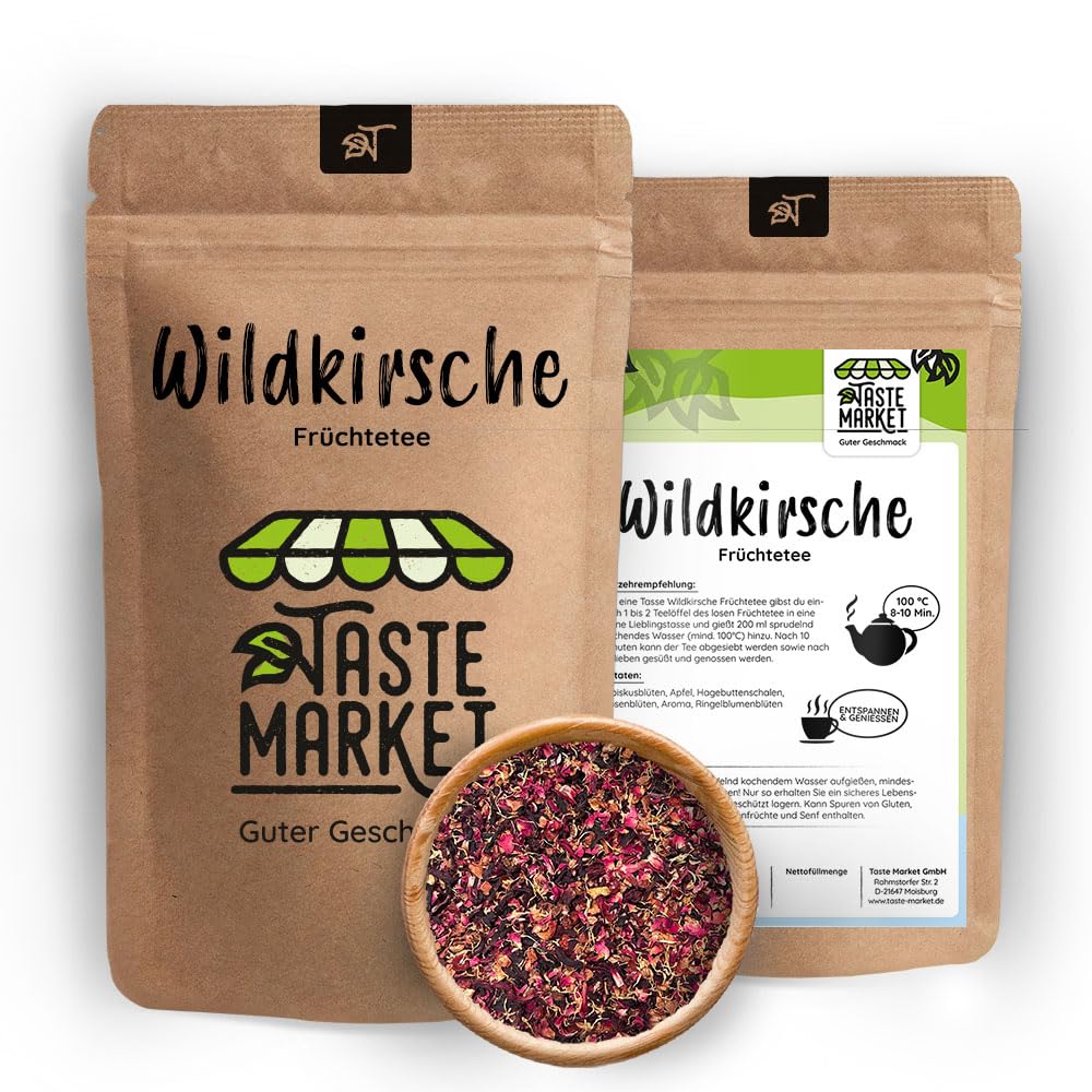 Some days, eating cherries just isn't your thing? No problem, then drink them! Our Wild Cherry Tea is a blend of hibiscus flowers, apple pieces, rosehip peel, rose petals, calendula flowers, and, of course, the aromatic, fruity taste of cherry. Wild cherry is a fruity treat both hot and cold. If you want to enjoy the tea cold, you must pour it over hot water and let it steep for at least eight minutes! This is the only way to ensure it's safe to drink. Once the fruit tea has cooled, you can add a little cherry juice and some ice cubes for a refreshing iced tea in no time. For a cup of hot tea, simply steep 2 teaspoons of loose-leaf fruit tea in 200 ml of boiling water for 10 minutes. After that, the tea can be strained, sweetened to taste, and enjoyed. For tea lovers who enjoy fruity flavors, this wild cherry tea blend is a must-try. With a tea infuser (also available in our Market section), this blend makes a perfect gift or present. INGREDIENTS Hibiscus flowers, apples, rosehip peel, rose petals, flavoring, calendula flowers INSTRUCTIONS To make a cup of wild cherry fruit tea, simply add 1 to 2 teaspoons of loose-leaf fruit tea to your favorite mug and pour over 200 ml of freshly boiled water (minimum 100 C). After 10 minutes, the tea can be strained, sweetened, and enjoyed to taste. SAFETY WARNING Always use freshly boiled water and let it steep for at least 5-10 minutes! This is the only way to obtain a safe food. Store in a cool, dry place away from light. May contain traces of gluten, eggs, soy, sesame, milk, nuts, and mustard. Nutritional values, textual descriptions, or other representations may vary slightly from the actual product delivered. This product is sold in accordance with food legislation requirements. Other applications are not considered by us. These analytical values are subject to the usual biological variations of natural products. See more2 x 1 kg de cerise sauvage - Thé aux fruits en vrac - Thé aux cerises - aromatisé - Taste MarketDESCRIPTION DU PRODUIT DESCRIPTION DU PRODUIT Il y a des jours, il n'est pas bon de manger des cerises avec toi ? Pas de problème, alors vous les buvez. Notre thé aux cerises sauvages est un mélange de fleurs d'hibiscus, de morceaux de pomme, d'écorces d'églantier, de pétales de rose, de fleurs de calendula et, bien sûr, du goût fruité aromatique de la cerise. La cerise sauvage est un régal fruité à la fois chaud et froid. Si vous voulez profiter du thé froid, vous devez le verser avec de l'eau chaude et laisser infuser au moins huit minutes! C'est la seule façon d'obtenir un aliment sûr. Une fois que le thé aux fruits est refroidi, vous pouvez ajouter un peu de jus de cerise et quelques glaçons et obtenir un thé glacé rafraîchissant en un clin d'œil. Pour une tasse de thé chaud, il suffit de laisser infuser 2 cuillères à café de thé aux fruits en vrac dans 200 ml d'eau bouillante pendant 10 minutes. Après cela, le thé peut être filtré, sucré arbitrairement et dégusté. Pour les amateurs de thé qui aiment le fruité, ce mélange de thé sauvage est une recommandation absolue. Avec une pince à thé que vous obtenez également sur notre bouton Market, la cerise sauvage est également idéale comme idée cadeau ou cadeau INGRÉDIENTS Fleurs d'hibiscus, pommes, écorces d'églantier, pétales de rose, arôme, fleurs de calendula MODE D'EMPLOI Pour une tasse de thé aux fruits à la cerise sauvage, il suffit d'ajouter 1 à 2 cuillères à café de thé aux fruits en vrac dans une tasse préférée et de verser 200 ml d'eau bouillante pétillante (min. 100 C). Après 10 minutes, le thé peut être filtré et sucré et dégusté au goût. AVERTISSEMENT DE SÉCURITÉ Toujours verser de l'eau bouillante pétillante, laisser infuser au moins 5-10 minutes! C'est la seule façon d'obtenir un aliment sûr. Conserver dans un endroit frais, sec et à l'abri de Peut contenir des traces de gluten, œufs, soja, sésame, lait, fruits à coque et moutarde. Les valeurs nutritionnelles, descriptions textuelles ou autres représentations peuvent varier légèrement de la marchandise réellement livrée. Ce produit est vendu selon les exigences de la législation alimentaire. D'autres applications ne sont pas examinées par nous. Ces valeurs d'analyse sont soumises aux variations biologiques habituelles des produits naturels. Voir plus