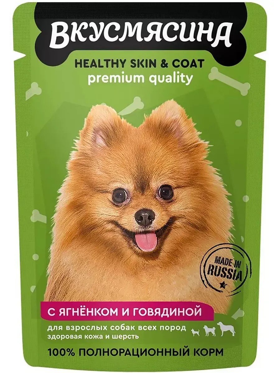 Корм Вкусмясина Healthy skin coat (в соусе) для собак, здоровая кожа и шерсть, с ягненком и говядиной, 85 г Полнорационные консервированные корма паучи для собак ВКУСМЯСИНА - это сочные мясные кусочки в ароматном соусе в ассортименте. Попробуйте разные вкусы и покупайте тот, который придется вашему питомцу по душе! Корма разработаны по специальной рецептуре, учитывающей все потребности и физические особенности собак. Не содержат сою, искусственные красители, консерванты и ГМО. ВКУСМЯСИНА - только самое вкусное и полезное для вашего питомца! Содержит все необходимые витамины, минералы и питательные вещества, поддерживающие здоровье вашего любимца. Подходят для ежедневного кормления. Поддерживают гармоничный рост и развитие питомца. Влажный корм для собак подходит для любых пород: немецкий шпиц, французский бульдог, чихуахуа, йоркширский терьер, кинг спаниель чарльз, акита, сиба ину, бигль, питбуль, доберман, корги, ротвейлер, лабрадор, мопс, немецкая овчарка, такса, хаски, джек рассел и др. Состав: мясо (в т. ч. телятина не менее 4%) и субпродукты (в т. ч. язык не менее 4%), мясной бульон, злаки, витамины и минеральные вещества Питательная ценность (в 100 г продукта): белки - 6 г, жиры - 4 г, зола - 2, 5 г, клетчатка - 0, 3 г, влага - 84 г. Минеральные вещества (в 100 г продукта): кальций - 0, 5 г, фосфор - 0, 4 г, медь - 0, 32 мг, цинк - 5, 4 мг Витамины (в 100 г продукта): витамин А - 130 МЕ, витамин Е - 0, 9 мг, Омега-3 - 0, 17 г, Омега-6 - 1, 6 г. Энергетическая ценность (в 100 г продукта): 67 ккал/280 кДж Рекомендуемые суточные нормы кормления: для собак весом 1-3 кг - 85-300 г (1-4 упаковки), для собак весом 4-6 кг - 300-600 г (4-7 упаковок), для собак весом 7-10 кг - 600-1020 г (7-12 упаковок). Переход с предыдущего рациона осуществлять постепенно, небольшими порциями в течение 5-7 дней