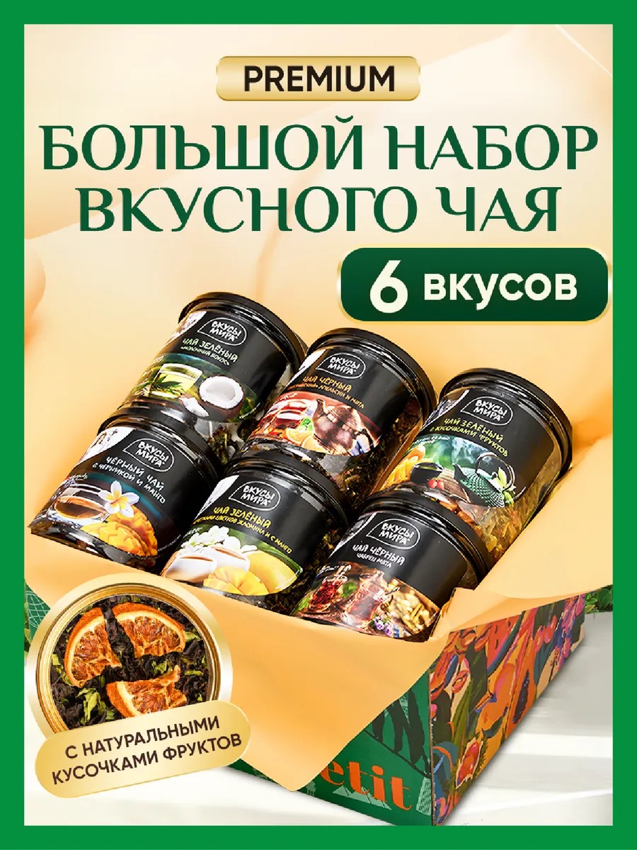 | Package contents | Black tea with blueberries and mango; Large-leaf black tea with thyme and mint; Black tea "Maghreb" orange and mint; Green tea with pieces of fruit; Green tea with flower petals; Green Tea "Milk Coconut" |