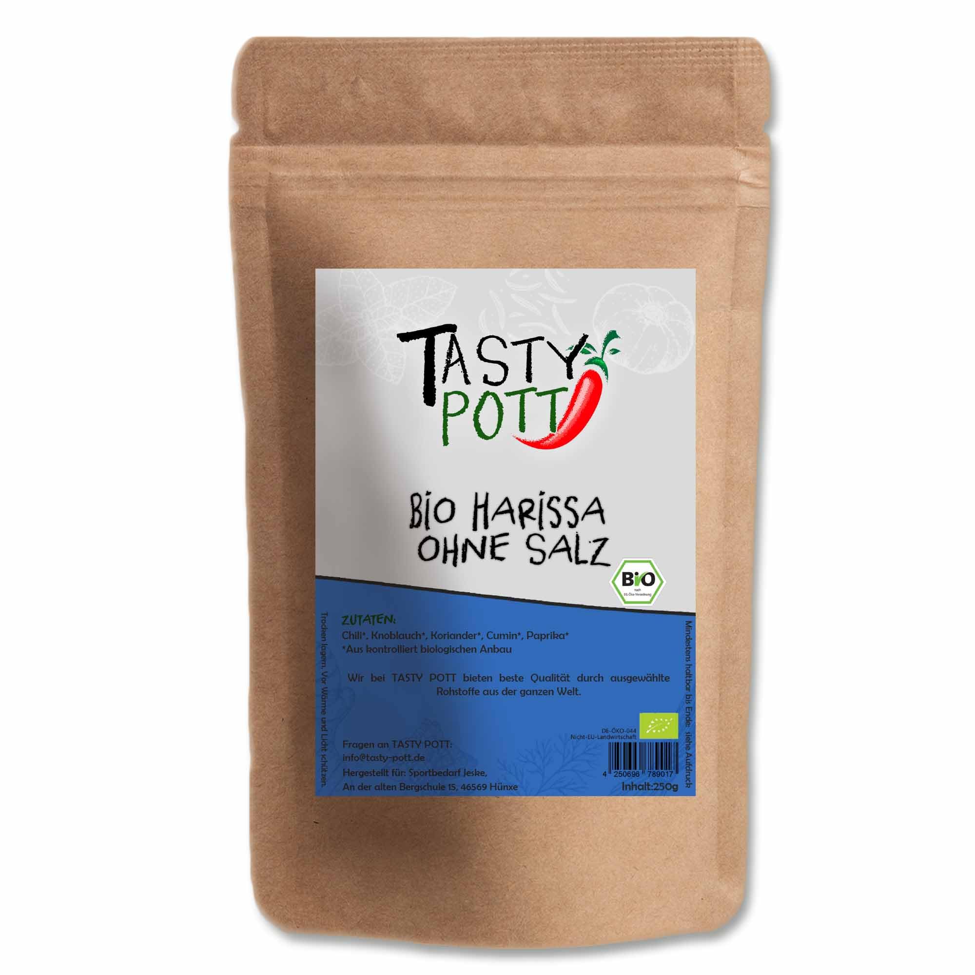 Tasty Pott Harissa bio sans sel 250 g Assaisonnement marinade Cuisson rôti Sauce à la viande Marinade Dips Ragoûts Soupes Pack avantageux Sac de conservation
