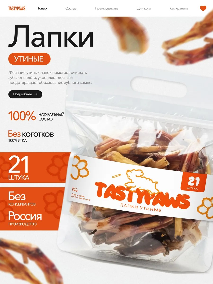 Порадуйте своего питомца вкусным и полезным угощением! Сушёные утиные лапки TastyPaws — это натуральный источник кальция, фосфора, витаминов A, B9 и других микроэлементов, необходимых для здоровья костей, зубов, кожи и шерсти.