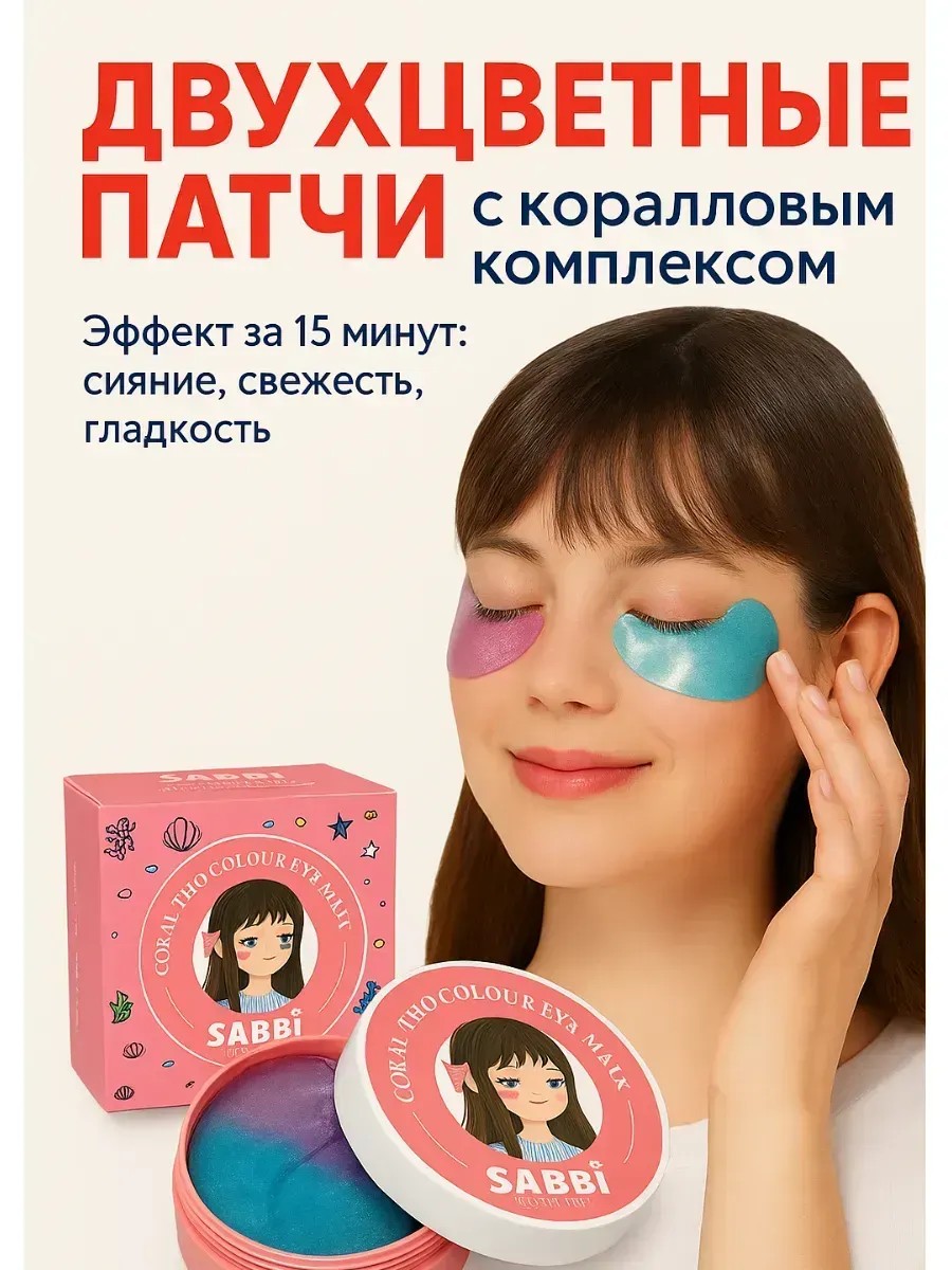 Откройте для себя премиальный уход за кожей вокруг глаз с двухцветными гидрогелевыми патчами Sabbi. Уникальный коралловый комплекс в составе обеспечивает комплексное восстановление, питание и глубокое увлажнение.
