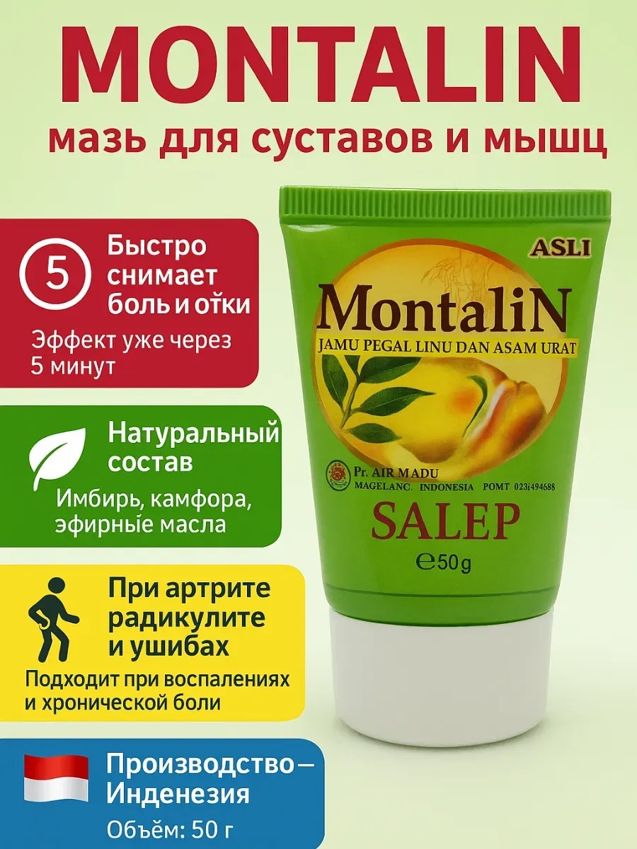 Effective natural joint ointment Montalin Salep is a proven remedy from Indonesia for relieving joint pain, arthritis, arthrosis, osteochondrosis, myositis, radiculitis, as well as swelling and inflammation.