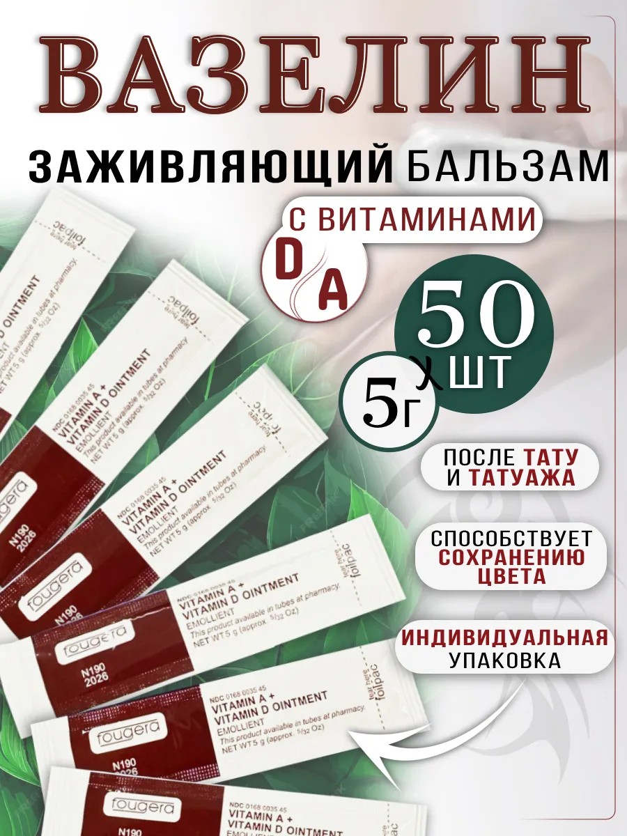 Fougera tattoo and permanent makeup ointment in a sachet with vitamins promotes skin healing after tattoos, permanent makeup, papilloma removal, and eyebrow and lip tattooing. Vaseline Vaseline for tattooing is applied to exposed skin of the eyebrows, lips, and damaged areas, and can be used as a healing cream. This healing ointment for tattoos heals and moisturizes the skin, protecting against scars. Vitamins A and D are included in the tattoo aftercare formula, which helps accelerate skin healing. Vaseline cosmetic gel also contains lanolin, which further helps combat facial scars. This healing ointment accelerates tissue healing, preventing dryness and scar formation. Fougera Vaseline can also be used as a healing lip balm, especially indispensable in winter. We are also found by searches for vitamin ointment, Vaseline after tattoos, permanent makeup, and healing ointment. The healing ointment can also be used as a lip balm and has proven itself to be very effective. Vaseline for permanent makeup and tattooing is packaged in 50, 25, or 10 sachets, depending on your order. Each sachet contains 5 ml of ointment. The healing ointment is suitable for tattoo artists. The tattoo healing ointment is also suitable for sensitive skin.