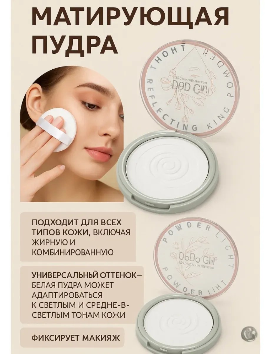 Матирующая пудра для лица Dodo Girl — идеальный выбор для тех, кто ищет стойкий макияж без жирного блеска. Прессованная пудра универсального оттенка адаптируется к светлым и средне-светлым тонам кожи, не утяжеляя её и не создавая эффекта маски. Она подходит для всех типов кожи, включая жирную, комбинированную и чувствительную. Благодаря лёгкой текстуре средство равномерно ложится на лицо и фиксирует тональный крем или BB-крем, обеспечивая эффект свежести на весь день. Пудра идеально скрывает жирный блеск в Т-зоне, выравнивает тон кожи, визуально сглаживает поры и мелкие несовершенства. Продукт особенно востребован среди тех, кто ищет лёгкую пудру для ежедневного использования или компактную косметику в дорогу. Удобный формат позволяет легко носить средство в сумочке и использовать в течение дня для коррекции макияжа. Пудра не содержит ярко выраженного оттенка, поэтому не выбеливает лицо и не конфликтует с основным тоном. Идеально подходит для макияжа в любое время года. Прозрачная упаковка с зеркальным эффектом делает товар визуально привлекательным и удобным в использовании. Это косметическое средство стало выбором многих визажистов и бьюти-блогеров благодаря своему качеству, стойкости и универсальности. Если вы ищете недорогую, но качественную пудру, которая справится с блеском и продлит стойкость макияжа — Dodo Girl станет отличным решением. Пользователи отмечают удобство нанесения, комфортное ощущение на коже и надёжную фиксацию. Матовая пудра для лица — незаменимый элемент в косметичке каждой девушки, которая заботится о безупречном внешнем виде.