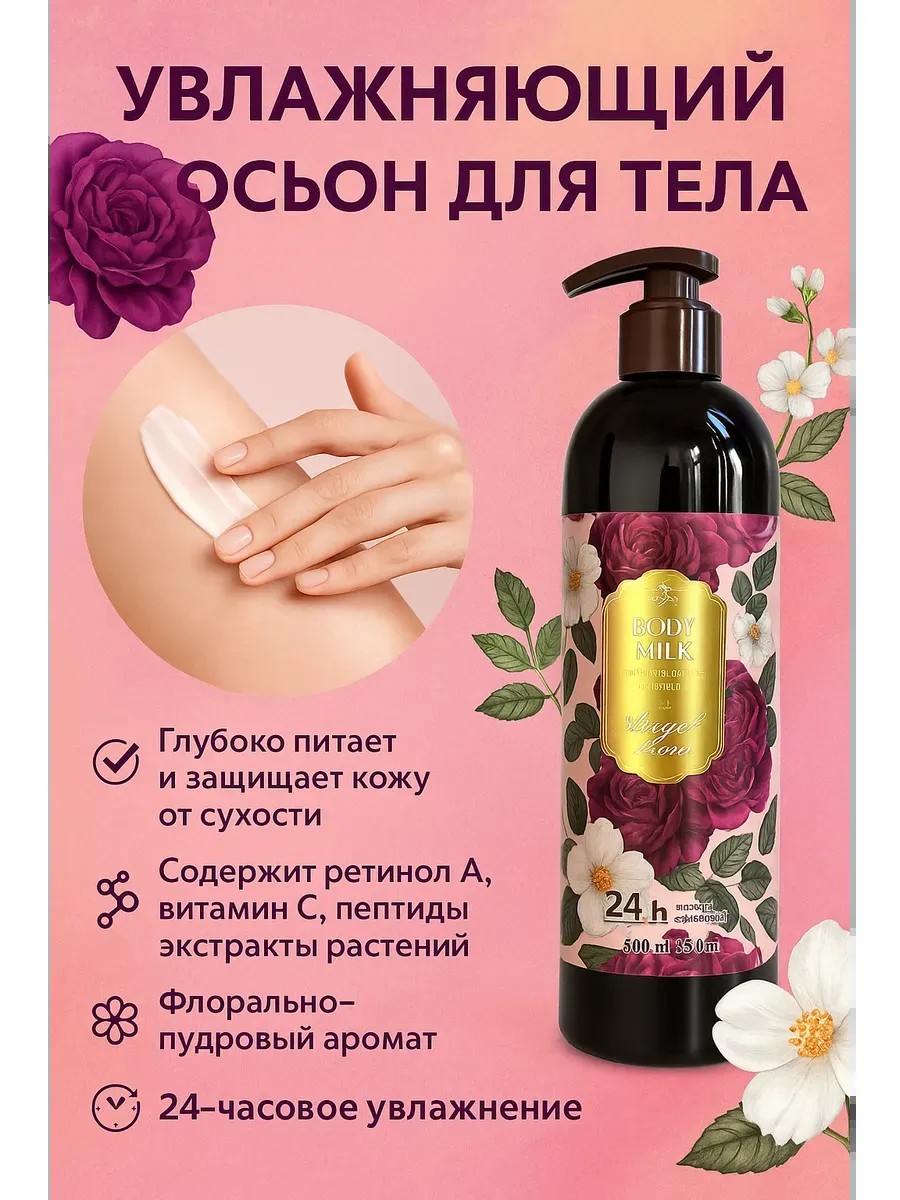 Увлажняющий лосьон для тела с нежным флорально-пудровым ароматом создан для интенсивного ухода за сухой и чувствительной кожей. Благодаря легкой текстуре он быстро впитывается, не оставляя жирной пленки, и обеспечивает длительное ощущение комфорта. Лосьон глубоко питает, эффективно устраняет ощущение стянутости и шелушения, делая кожу гладкой, мягкой и ухоженной на протяжении 24 часов. Идеально подходит для использования после душа, особенно в зимний период, когда кожа нуждается в особом уходе и восстановлении. Формула с ретинолом A способствует обновлению клеток, улучшает текстуру кожи и повышает её упругость. Витамин C осветляет, придаёт коже здоровое сияние, борется с тусклостью и следами усталости. Комплекс пептидов в сочетании с экстрактами растений укрепляет защитный барьер и насыщает кожу влагой, предотвращая её обезвоживание. Лосьон рекомендован для ежедневного ухода за телом, особенно после бритья, солнечного воздействия или в период сезонной сухости. Он помогает поддерживать водный баланс и придаёт коже ухоженный вид уже после первого применения. Средство подходит для всех типов кожи и может использоваться на локтях, коленях, ногах и других участках с повышенной сухостью. Благодаря удобному дозатору расход средства экономичный, а стильный флакон украсит любую ванную комнату. Это идеальный выбор для тех, кто ищет качественный лосьон для тела с ароматом, который не перебивает парфюм, а гармонично его дополняет. Отлично подойдёт для ухода за телом в домашних условиях, для женщин, ценящих уход и комфорт.