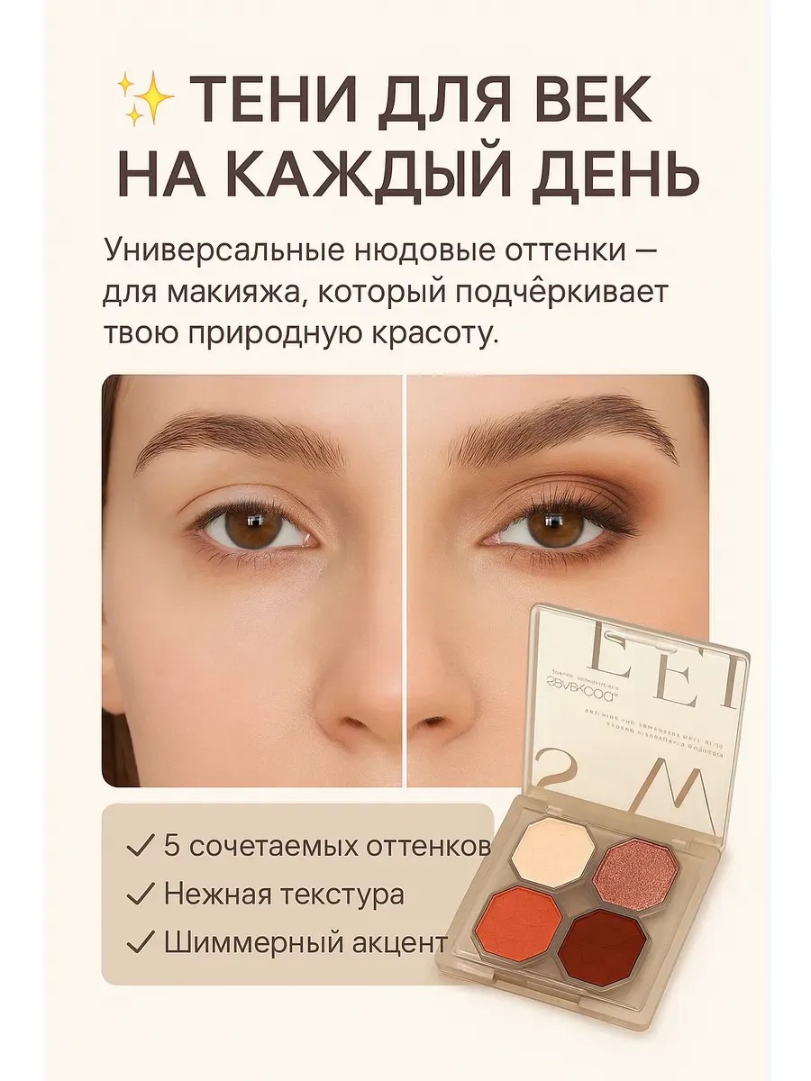 This product falls into the "nude eyeshadow," "eyeshadow palette," and "shimmer eyeshadow" categories—some of the most popular searches on marketplaces. Thanks to its balanced color scheme, this palette allows you to create basic eye makeup, highlight natural beauty, or add sparkle with a shimmery accent.