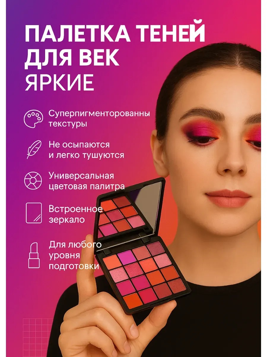 Палетка теней для век — это must-have в косметичке каждой девушки, стремящейся к выразительному и стильному макияжу глаз. Благодаря многообразию оттенков от нюдовых до насыщенных фуксий и винных тонов, она подойдёт как для повседневного, так и для вечернего образа. Матовые, шиммерные и сатиновые текстуры легко наносятся, хорошо растушёвываются и держатся на веках до 10 часов, не осыпаясь и не скатываясь. Это профессиональные тени для глаз, которые выбирают визажисты и блогеры. Пигментация теней позволяет создавать плотный цвет с первого слоя, а универсальные оттенки отлично подойдут для любого цветотипа. Благодаря встроенному зеркалу и компактному формату, палетка легко помещается в сумочку или дорожную косметичку — идеальный вариант для поездок и макияжа вне дома. Особенно популярны среди пользователей такие оттенки как бордовый, розовый шиммер, красный матовый, терракотовый и классический беж. Палетка идеально подходит для смоки-айс, акцентных стрелок, дневного нюдового макияжа и ярких цветных луков. Лёгкая текстура и насыщенный пигмент делают её удобной даже для новичков. Это отличный подарок для девушки, женщины или подруги, которая любит качественную косметику и следит за трендами макияжа. Палетка теней с зеркалом станет вашим универсальным помощником для создания выразительного взгляда. Косметика для глаз с богатой палитрой всегда востребована, а компактная и стильная упаковка делает эту палетку особенно привлекательной. Подходит для всех типов кожи, в том числе чувствительной. Является хитом продаж в категории макияж глаз и входит в топ популярных теней на маркетплейсах. Отличный выбор для ежедневного использования, праздничного макияжа, фотосессий и вечерних выходов.