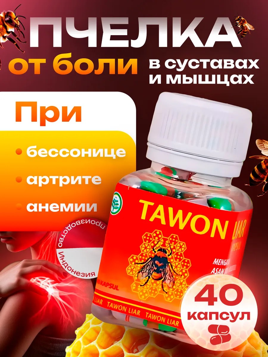 Tawon Liar - уникальные комплексные бады в капсулах, произведенные в Индонезии и разработанные специально для борьбы с болями в суставах, мышцах и связках. Натуральная формула тавон лиар содержит ингредиенты, помогающие справиться с дискомфортом. Корень имбиря способствует улучшению кровообращения и снижению уровня холестерина, уменьшая риск возникновения заболеваний, связанных с сердцем и сосудами. Куркума помогает снизить отечность и улучшить подвижность коленей и локтей. Включает природный компонент - куркумин, известный своими противовоспалительными и обезболивающими свойствами. Женьшень обладает общеукрепляющими функциями и обеспечивает защиту иммунитета. Маточное молочко имеет мочегонное действие и содержит множество витаминов, минералов и питательных элементов, укрепляющих иммунную систему и борющихся с воспалениями. Пищевая добавка также содержит вспомогательные вещества, улучшающие усвояемость и эффективность. Бад снимает сильные болевые ощущения во всем теле, в том числе в пальцах ног и рук. Продукт taiwan liar биодобавка особенно актуален для взрослых женщин и мужчин, занимающихся спортом или страдающих от анемии конечностей, болезни подагра, артрита или артроза. Лечебный комплекс montalin противопоказан беременным девушкам, кормящим мамам и людям с индивидуальной непереносимостью составляющих. Средство монталин применяется при бессоннице, ломоте костей, иммунодефиците, слабости в организме и вялости. Таблетки не являются лекарством. При наличии любых хронических проблем с печенью, желудком или дыхательными путями, следует, перед началом приема, проконсультироваться с врачом. Подходят для мужской и женской аудитории. Позаботьтесь о здоровье и избавьтесь от неприятных чувств вместе с эффективным препаратом пчелка!