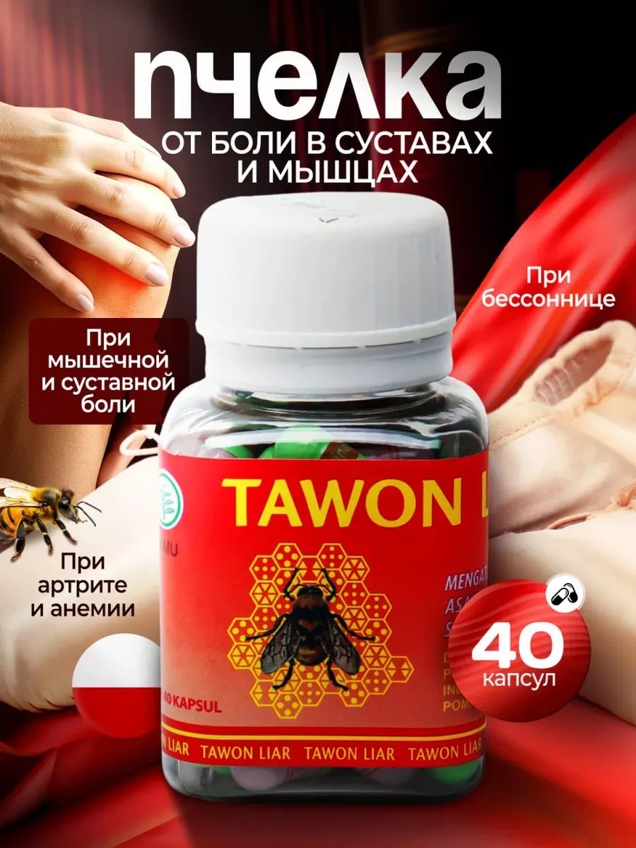 Tawon Liar - уникальные комплексные бады в капсулах, произведенные в Индонезии и разработанные специально для борьбы с болями в суставах, мышцах и связках. Натуральная формула тавон лиар содержит ингредиенты, помогающие справиться с дискомфортом. Корень имбиря способствует улучшению кровообращения и снижению уровня холестерина, уменьшая риск возникновения заболеваний, связанных с сердцем и сосудами. Куркума помогает снизить отечность и улучшить подвижность коленей и локтей. Включает природный компонент - куркумин, известный своими противовоспалительными и обезболивающими свойствами. Женьшень обладает общеукрепляющими функциями и обеспечивает защиту иммунитета. Маточное молочко имеет мочегонное действие и содержит множество витаминов, минералов и питательных элементов, укрепляющих иммунную систему и борющихся с воспалениями. Пищевая добавка также содержит вспомогательные вещества, улучшающие усвояемость и эффективность. Бад снимает сильные болевые ощущения во всем теле, в том числе в пальцах ног и рук. Продукт taiwan liar биодобавка особенно актуален для взрослых женщин и мужчин, занимающихся спортом или страдающих от анемии конечностей, болезни подагра, артрита или артроза. Лечебный комплекс montalin противопоказан беременным девушкам, кормящим мамам и людям с индивидуальной непереносимостью составляющих. Средство монталин применяется при бессоннице, ломоте костей, иммунодефиците, слабости в организме и вялости. Таблетки не являются лекарством. При наличии любых хронических проблем с печенью, желудком или дыхательными путями, следует, перед началом приема, проконсультироваться с врачом. Подходят для мужской и женской аудитории. Позаботьтесь о здоровье и избавьтесь от неприятных чувств вместе с эффективным препаратом пчелка!