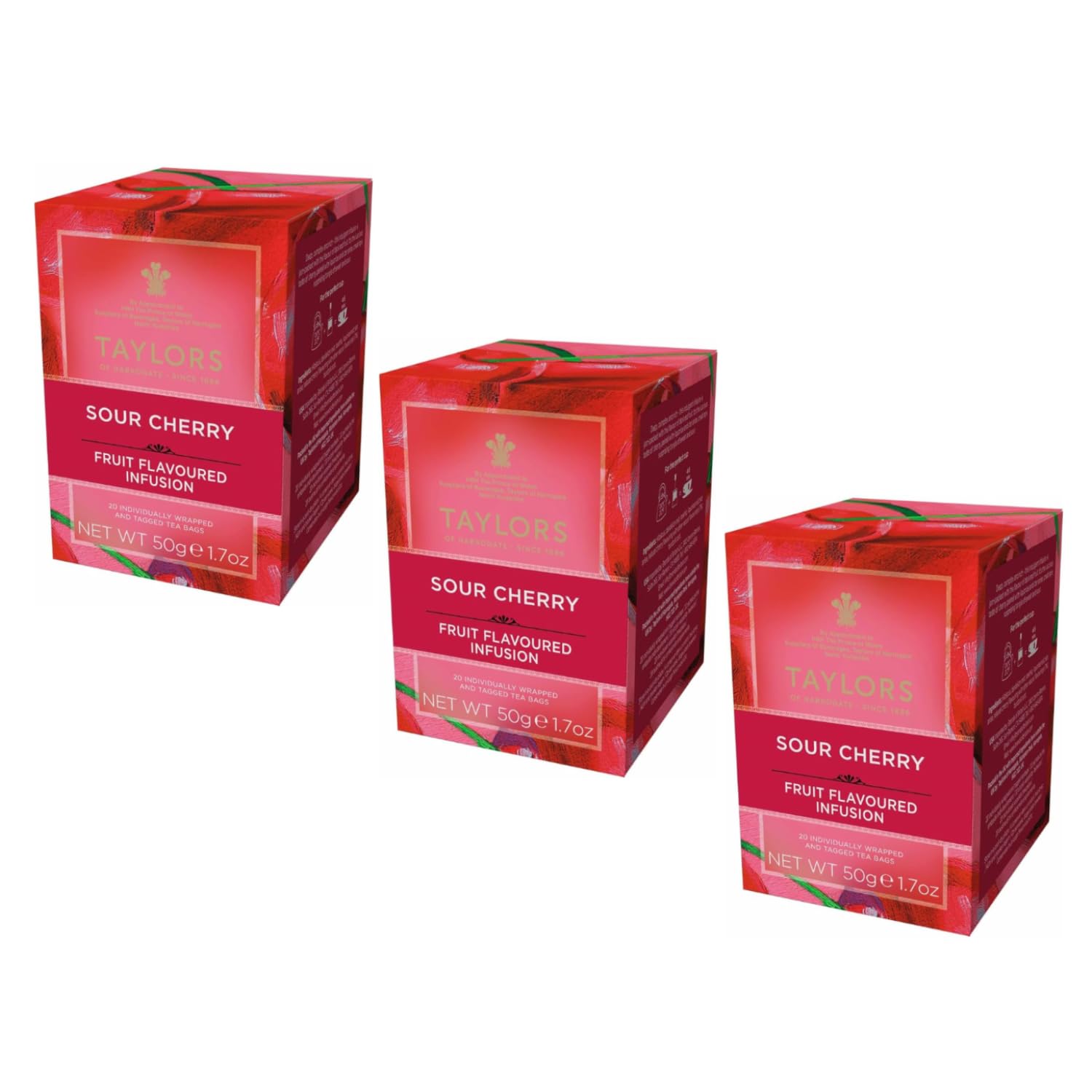 TAYLORS We are an independent, family-run tea and coffee company from Harrogate, Yorkshire. We have strong family values, such as a love of fairness, quality, creativity, and the importance of treating people with respect. And we are fully dedicated to the pursuit of extraordinary flavors. Our story began in 1886 when Charles Taylor and his two sons founded a tea and coffee business. C. E. Taylors Sons became known for its quality, and the flagship shop at 1 Parliament Street, Harrogate, became famous throughout the region. "Caffeine-Free Cherry Infusion": A caffeine-free cherry infusion. Deep, complex, and rich, this delicious brew is bursting with red fruit flavors. The succulent taste of cherry combined with licorice and star anise creates a surprising sweet and sour blend. (3 x 20 individually wrapped tea bags – 150 grams). Made in the UK. [CERTIFIED ETHICAL TEA] - We are proud founding members of the Ethical Tea Partnership and also hold Rainforest Alliance certifications to conserve biodiversity and ensure sustainable living conditions. [WIDE SELECTION] - The Taylors range offers a wide selection of teas and herbal infusions, from rich, select black teas to organic and decaffeinated blends, elegant green teas, and refreshing infusions. [CHERRY Hibiscus] - A deep, complex, rich, and delicious infusion bursting with red berry flavors. The succulent taste of cherry combined with licorice and star anise creates a surprising sweet and sour interplay. [PREPARATION] - To make one cup of product, infuse one tea bag for approximately 4 to 5 minutes in water at a temperature of around 100 C. The product is packaged in the UK. [DETAILS] - The shipment includes 3 boxes of herbal teas flavored with cherry, hibiscus, and rosehip, for a total of. INGREDIENTS Hibiscus, dandelion root, rosehip, licorice root, star anise, natural cherry flavoring with other natural flavorings 7 , burdock root.Taylors Infusion Cerise Hibiscus et Rose Musquée Tisane aux fruits sans caféine - 3 x 20 filtres (150 g)DESCRIPTION DU PRODUIT DESCRIPTION DU PRODUIT TAYLORS Nous sommes une famille indépendante de thé et de café de Harrogate, dans le Yorkshire. Nous avons de fortes valeurs familiales, comme l'amour de l'équité, de la qualité, de la créativité et l'importance de traiter les gens avec respect. Et nous sommes entièrement dévoués à la recherche de saveurs extraordinaires. Notre histoire commence en 1886, lorsque Charles Taylor et ses deux fils fondent une entreprise de thé et de café. C. E. Taylors Sons est devenu connu pour sa qualité et le mag phare du 1 Parliament Street, Harrogate est devenu célèbre dans toute la région. "Infusion de cerises sans caféine" : infusion de cerises sans caféine. Profond, complexe et riche, ce délicieux breuvage regorge de saveurs de fruits rouges. Le goût succulent de la cerise associé à la réglisse et à l'anis étoilé crée un surprenant enchevêtrement aigre-doux. (3 x 20 sachets de thé emballés individuellement – 150 grammes). Fabriqué au Royaume-Uni. [THÉ ÉTHIQUE CERTIFIÉ] - Nous sommes fiers d'être membres fondateurs de l'Ethical Tea Partnership et possédons également les certifications Rainforest Alliance pour conserver la biodiversité et garantir des conditions de vie durables. [LARGE SÉLECTION] - La gamme Taylors propose une vaste sélection de thés et tisanes allant des riches thés noirs sélectionnés aux mélanges biologiques et décaféinés, des thés verts élégants aux infusions rafraîchissantes. [CERISE Hibiscus] - Une infusion profonde, complexe, riche et délicieuse, pleine de saveurs de fruits rouges. Le goût succulent de la cerise associé à la réglisse et à l'anis étoilé crée un surprenant enchevêtrement aigre-doux. [PRÉPARATION] - Pour obtenir une tasse de produit, faire infuser un sachet de thé pendant environ 4 à 5 minutes dans de l'eau à une température d'environ 100 C. Le produit est emballé au Royaume-Uni. [DÉTAILS] - L'envoi comprend 3 boîtes de tisanes aromatisées à la cerise, à l'hibiscus et à l'églantier, pour un tot. INGRÉDIENTS Hibiscus, racine de pissenlit, églantier, racine de réglisse, anis étoilé, arôme naturel de cerise avec autres arômes naturels 7 , racine de bardane.