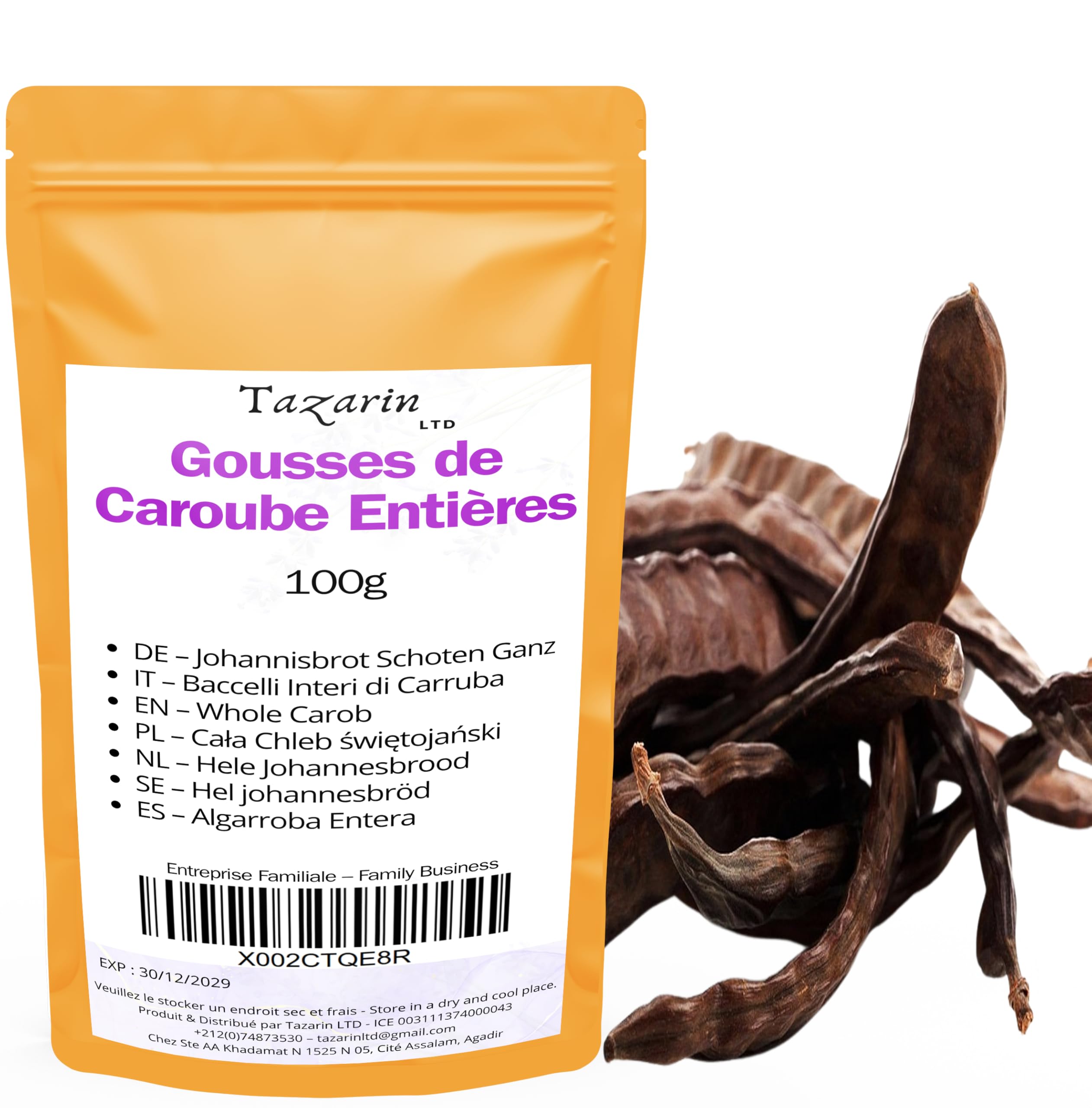 WHOLE CAROB PODS – 100 NATURAL AND UNTREATED Discover the benefits of whole carob pods, a traditional superfood rich in fiber and naturally sweet. Used since ancient times as an alternative to cocoa or as a natural remedy, these pods are ideal for eating raw, making an infusion, or grinding into homemade powder. ? 100 Pure Natural: No additives, preservatives, or chemical treatments – hand-harvested and naturally sun-dried. ? Healthy Alternative to Cocoa: Naturally sweet taste, caffeine-free, ideal for children and those with sensitivities. ? Natural Source of Fiber Minerals: Promotes digestion and intestinal well-being. ? Multiple Uses: Chew as a snack, infuse, grind into powder, or enrich your homemade recipes (baking, smoothies, porridges). ? Controlled Origin: Product from sustainable Mediterranean crops, hand-harvested for optimal quality. ? Suitable for vegan gluten-free diets: Raw, unprocessed product, compatible with a healthy and natural diet. INGREDIENTS 100g Whole Carob Pods100g Gousses de Caroube entières Gousses de Caroube Séchées Caroube entier, Arôme Goût Intense - 100 Naturel, Pur et Sans Additifs TazarinLtdDESCRIPTION DU PRODUIT DESCRIPTION DU PRODUIT GOUSSES DE CAROUBE ENTIÈRES – 100 NATURELLES ET NON TRAITÉES Découvrez les bienfaits des gousses de caroube entières, un super-aliment traditionnel riche en fibres et naturellement sucré. Utilisées depuis l'Antiquité comme alternative au cacao ou comme remède naturel, ces gousses sont idéales pour une consommation directe, en infusion, ou pour être réduites en poudre maison. ? 100 Pures Naturelles : Sans additifs, sans conservateurs, ni traitement chimique – issues d'une récolte artisanale et séchées naturellement au soleil. ? Alternative Saine au Cacao : Goût naturellement sucré, sans caféine, idéal pour les enfants et les personnes sensibles. ? Source Naturelle de Fibres Minéraux : Favorise la digestion et le bien-être intestinal. ? Utilisations Multiples : À mâcher comme collation, à infuser, à broyer en poudre ou pour enrichir vos recettes maison (pâtisserie, smoothies, bouillies). ? Origine Contrôlée : Produit provenant de cultures méditerranéennes durables, récolté à la main pour une qualité optimale. ? Convient aux régimes végétalien sans gluten : Produit brut non transformé, compatible avec une alimentation saine et naturelle. INGRÉDIENTS 100g Gousses de Caroube entières