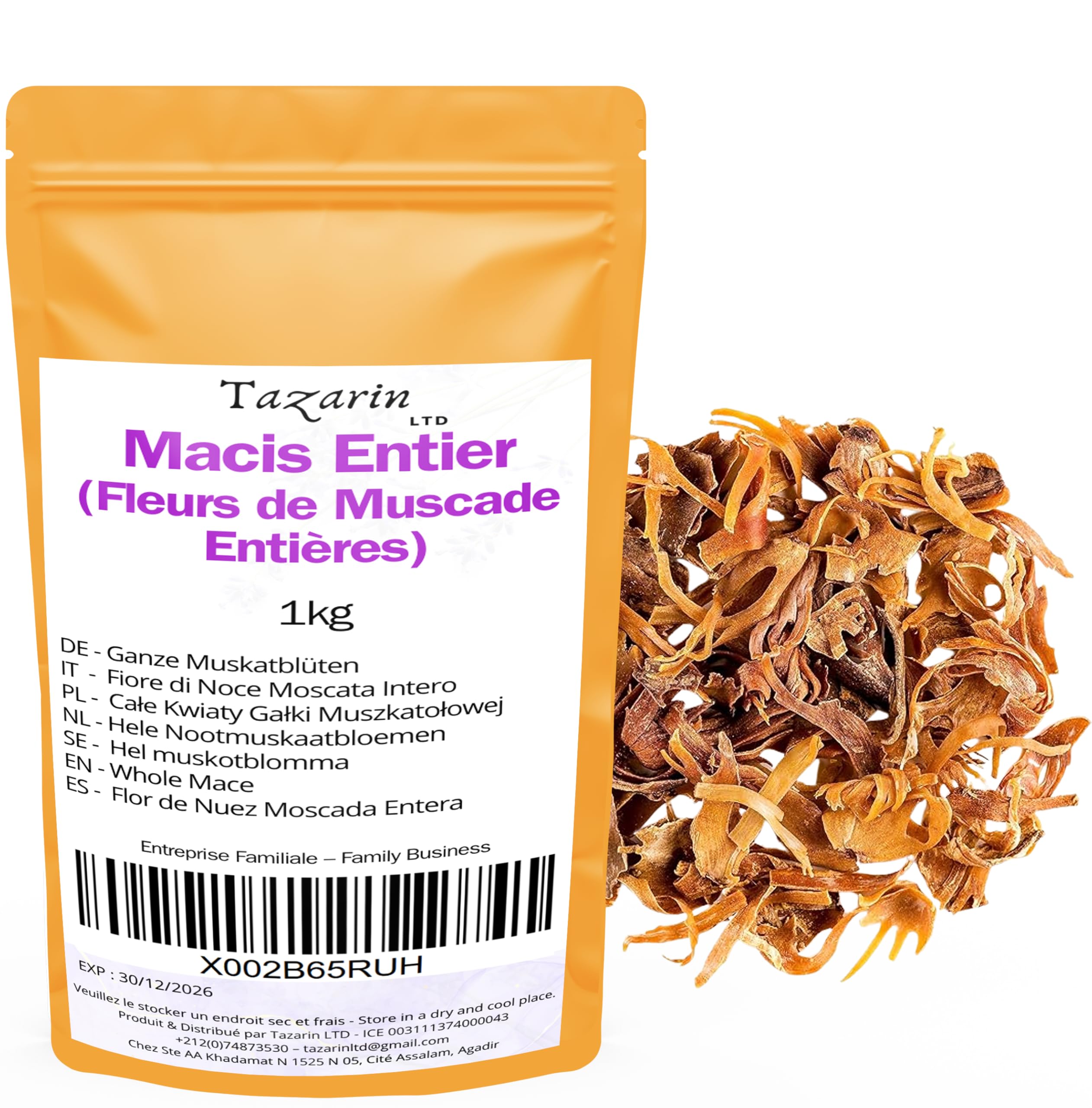 Nutmeg Flower (mace) is a fine and precious spice obtained from the outer covering of the nutmeg. Native to tropical regions, primarily the Moluccas Islands in Indonesia, mace is an ancient spice that has transcended centuries and civilizations to become a staple in many culinary cultures. Compared to nutmeg, mace offers a milder and more subtle flavor, with hints of cinnamon and pepper. Its reddish-orange color makes it not only an aromatic addition but also visually appealing to a variety of dishes. It is primarily used in cooking to season savory dishes such as soups, stews, sauces, and curries. However, its sweet and fragrant taste also makes it popular in sweet preparations, such as pastries, desserts, and hot beverages. Beyond its culinary uses, mace is also recognized for its medicinal benefits. In traditional medicine, it is used to aid digestion, relieve gastrointestinal upset, and its carminative action helps reduce intestinal gas. It also possesses anti-inflammatory and antioxidant properties that contribute to strengthening the immune system. Used in moderation, powdered mace can add a unique depth of flavor to recipes while offering health benefits. It is a versatile, valuable, and beneficial spice that deserves a place in every kitchen. INGREDIENTS 1 kg Mace1kg Macis Entier - Fleurs de Muscade Entières - Arôme Goût Intense - 100 Naturel, Pur et Sans Additifs TazarinLtdDESCRIPTION DU PRODUIT DESCRIPTION DU PRODUIT La Fleurs de Muscade (macis) est une épice fine et précieuse obtenue à partir de l'enveloppe qui entoure la noix de muscade. Originaire des régions tropicales, principalement des îles Moluques en Indonésie, le macis est une épice ancienne qui a traversé les siècles et les civilisations pour s'intégrer dans de nombreuses cultures culinaires. Le macis, en comparaison avec la noix de muscade, offre une saveur plus douce et subtile, avec des nuances de cannelle et de poivre. Sa couleur rouge-orangée en fait non seulement un ajout aromatique, mais aussi visuellement attrayant dans divers plats. On l'utilise principalement dans la cuisine pour assaisonner des mets salés comme les soupes, les ragoûts, les sauces et les currys. Cependant, son goût doux et parfumé le rend également populaire dans des préparations sucrées, comme les pâtisseries, les desserts et les boissons chaudes. Au-delà de son utilisation culinaire, le macis est aussi reconnue pour ses bienfaits médicinaux. En médecine traditionnelle, elle est utilisée pour faciliter la digestion, soulager les troubles gastro-intestinaux, et son action carminative aide à réduire les gaz intestinaux. Elle possède également des propriétés anti-inflammatoires et antioxydantes qui contribuent à renforcer le système immunitaire. Utilisé avec modération, le macis en poudre peut ajouter une profondeur de saveur unique aux recettes tout en offrant des avantages pour la santé. C'est une épice polyvalente, à la fois précieuse et bénéfique, qui mérite une place dans toutes les cuisines. INGRÉDIENTS 1kg Macis