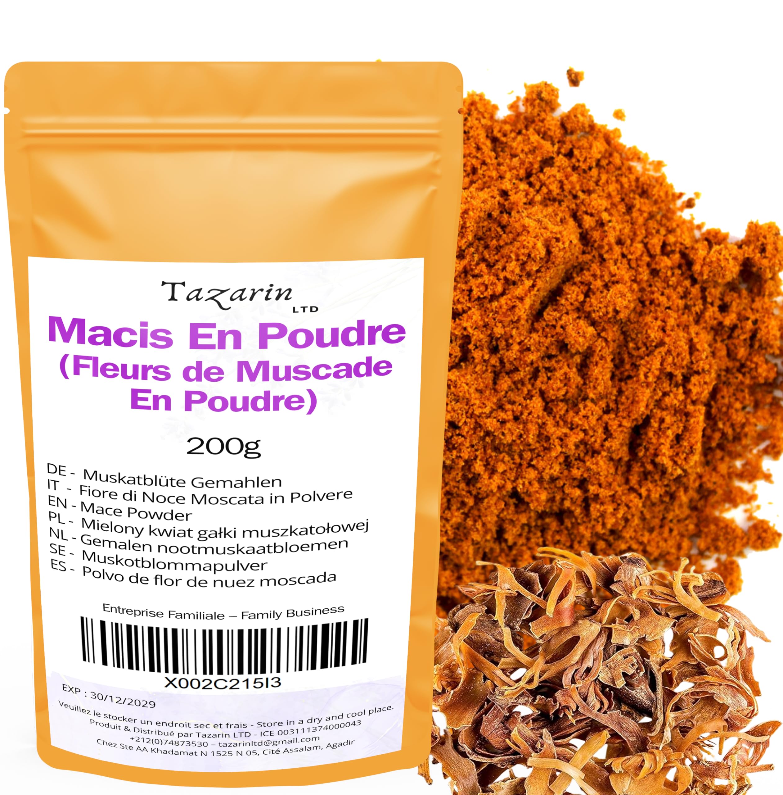 Mace powder is a fine and precious spice obtained from the outer covering of the nutmeg. Native to tropical regions, particularly the Moluccas Islands in Indonesia, mace is an ancient spice that has traversed centuries and civilizations to become a staple in many culinary traditions. Compared to nutmeg, mace offers a more delicate and subtle flavor, with hints reminiscent of cinnamon and pepper. Its reddish-orange color makes it not only an aromatic addition but also visually appealing to various dishes. It is primarily used in cooking to flavor savory dishes such as soups, stews, sauces, and curries. However, its sweet and fragrant taste also makes it a welcome addition to sweet preparations, such as pastries, desserts, and hot beverages. In addition to its culinary uses, mace powder is also known for its medicinal benefits. In traditional medicine, it is used to aid digestion, relieve gastrointestinal upset, and, thanks to its carminative action, reduce intestinal gas. It also possesses anti-inflammatory and antioxidant properties that help strengthen the immune system. Used in moderation, ground mace can add a unique depth of flavor to recipes, while also offering health benefits. It is a versatile, valuable, and beneficial spice that deserves a place in every kitchen. INGREDIENTS 200 g Ground Mace200g Macis poudre – Macis moulu, fleur de noix de muscade en poudre – arôme et goût intense – 100 naturel, de haute qualité - sans additifs, TazarinLtdDESCRIPTION DU PRODUIT DESCRIPTION DU PRODUIT La poudre de macis est une épice fine et précieuse obtenue à partir de l'enveloppe qui enveloppe la noix de muscade. Originaire des régions tropicales, en particulier des îles Molucche en Indonésie, le macis est une épice antique qui a traversé les siècles et les civilisations pour entrer dans de nombreuses culinaires. Par rapport à la muscade, le macis offre une saveur plus délicate et subtile, avec des nuances qui rappellent la cannelle et le poivre. Sa couleur rouge-orange en fait non seulement un ajout aromatique, mais aussi visuellement attrayant dans différents plats. Il est principalement utilisé en cuisine pour parfumer les plats salés tels que les soupes, les ragoûts, les sauces et le curry. Cependant, son goût doux et parfumé le rend également apprécié dans les préparations sucrées, telles que les pâtisseries, les desserts et les boissons chaudes. En plus de son utilisation culinaire, la poudre de macis est également connue pour ses bienfaits médicinaux. En médecine traditionnelle, elle est utilisée pour favoriser la digestion, soulager les troubles gastro-intestinaux et, grâce à son action carminative, réduire les gaz intestinaux. Il possède également des propriétés anti-inflammatoires et antioxydantes qui contribuent à renforcer le système immunitaire. Utilisé avec modération, le macis en poudre peut apporter une profondeur de saveur unique aux recettes, tout en offrant des bénéfices pour la santé. C'est une épice polyvalente, précieuse et bénéfique, qui mérite une place dans chaque cuisine. INGRÉDIENTS 200 g Macis en poudre