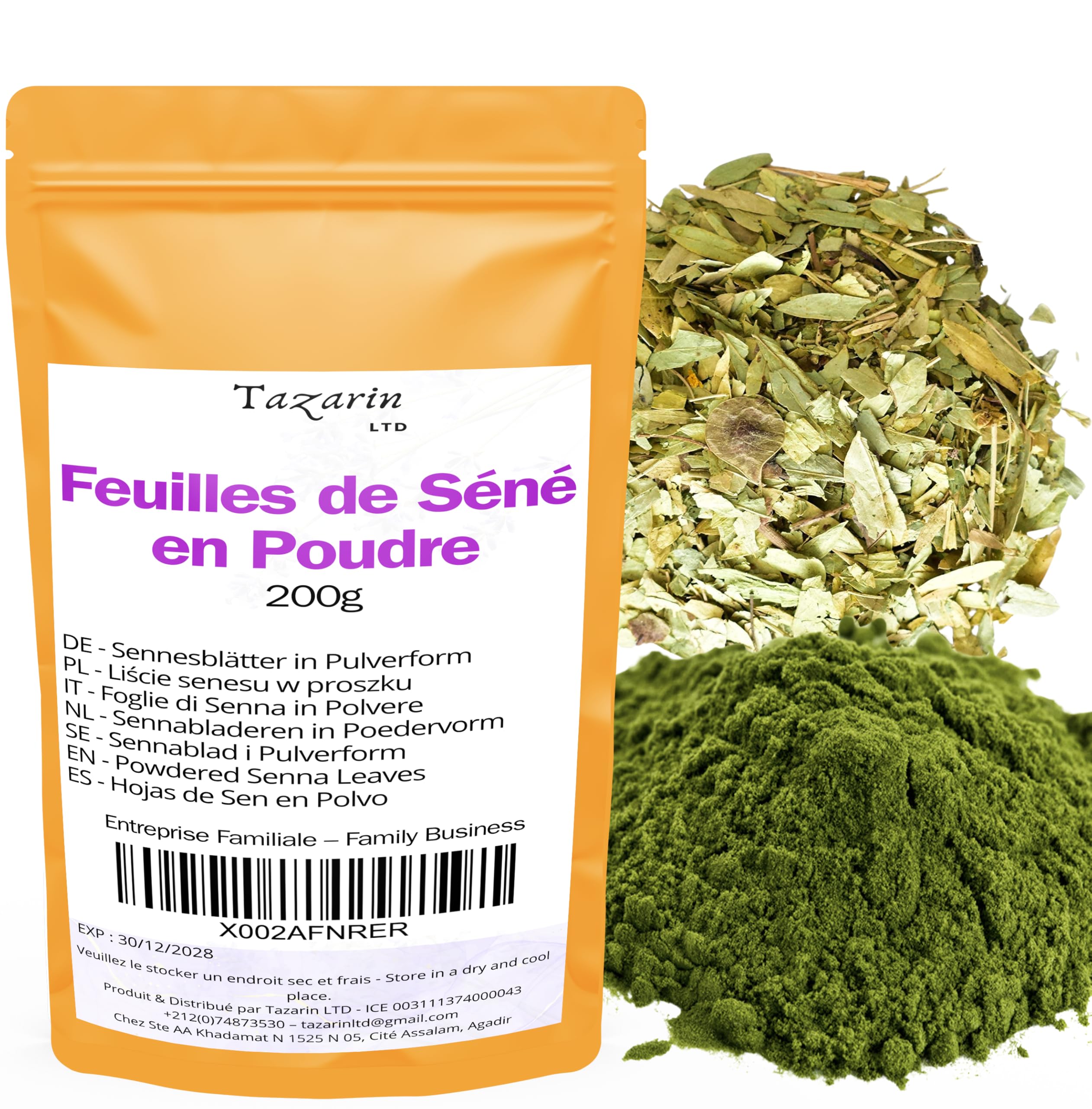 Senna powder is a natural product derived from the dried leaves of senna, a plant of the genus Cassia or Senna, widely used in herbal medicine for its laxative properties. Native to tropical regions, particularly Africa and Asia, senna has been known for centuries for its beneficial effects on digestion. Fun fact: Senna originates from the southern Arabian Peninsula and its name comes from the Arabic word Alsana . It has been used for millennia as a purgative. INGREDIENTS Senna Leaf PowderTazarin LTD: Tazarin LTD products are synonymous with superior quality and safe use. All products are produced, packaged, and shipped under the best hygienic conditions. ✓ High Quality: High-quality rhassoul powder, sun-dried to preserve its active ingredients. ✓ Ingredients: Powdered senna leaves (Senna Alexandrina) from India. ✓ Cosmetic Use: In skin treatments, senna powder is used as a natural ingredient to soothe irritations, reduce inflammation, and balance oily skin thanks to its antibacterial and antiseptic properties. ✓ Benefits: Senna (Senna Makki) is a powerful laxative that promotes intestinal transit without being harmful to health, making it an excellent remedy for constipation and sluggish bowels. It hydrates stools, increg their volume and facilitating defecation. It stimulates and restores the balance of the human digestive system.200g de poudre de feuilles de séné Séné en poudre - 100 naturelle, pure, de haute qualité - sans additifs, TazarinLtdDESCRIPTION DU PRODUIT DESCRIPTION DU PRODUIT La poudre de séné est un produit naturel dérivé des feuilles séchées du séné, une plante du genre Cassia ou Senna, largement utilisée en phytothérapie pour ses propriétés laxatives. Originaire des régions tropicales, en particulier d'Afrique et d'Asie, la séne est connue depuis des siècles pour ses effets bénéfiques sur la digestion. Anecdote : la séne provient du sud de la péninsule arabique et son nom vient de l'arabe Alsana . Elle est utilisée depuis des millénaires comme purgatif. INGRÉDIENTS Poudre de feuilles de sénéTazarin LTD : les produits Tazarin LTD sont synonymes de qualité supérieure et d'utilisation sûre. Tous les produits ont été produits, emballés et expédiés dans les meilleures conditions hygiéniques. ✓ Haute qualité : poudre de rhassoul de haute qualité et séchée au soleil pour préserver ses principes actifs. ✓ Ingrédients : feuilles de séné en poudre (Senna Alexandrine) d'Inde. ✓ Utilisation cosmétique : dans les traitements de la peau, la poudre de lavande est utilisée comme ingrédient naturel pour apaiser les irritations, réduire les inflammations et équilibrer les peaux grasses grâce à ses propriétés antibactériennes et antiseptiques. ✓ Bénéfices : La séne (Sana Makki) est un puissant laxatif qui favorise le transit intestinal sans être nocif pour la santé, c'est donc un excellent remède contre la constipation et la lenteur intestinale. Hydrate les selles, augmentant leur volume et facilitant la défécation. Stimule et restaure l'équilibre du système digestif humain.