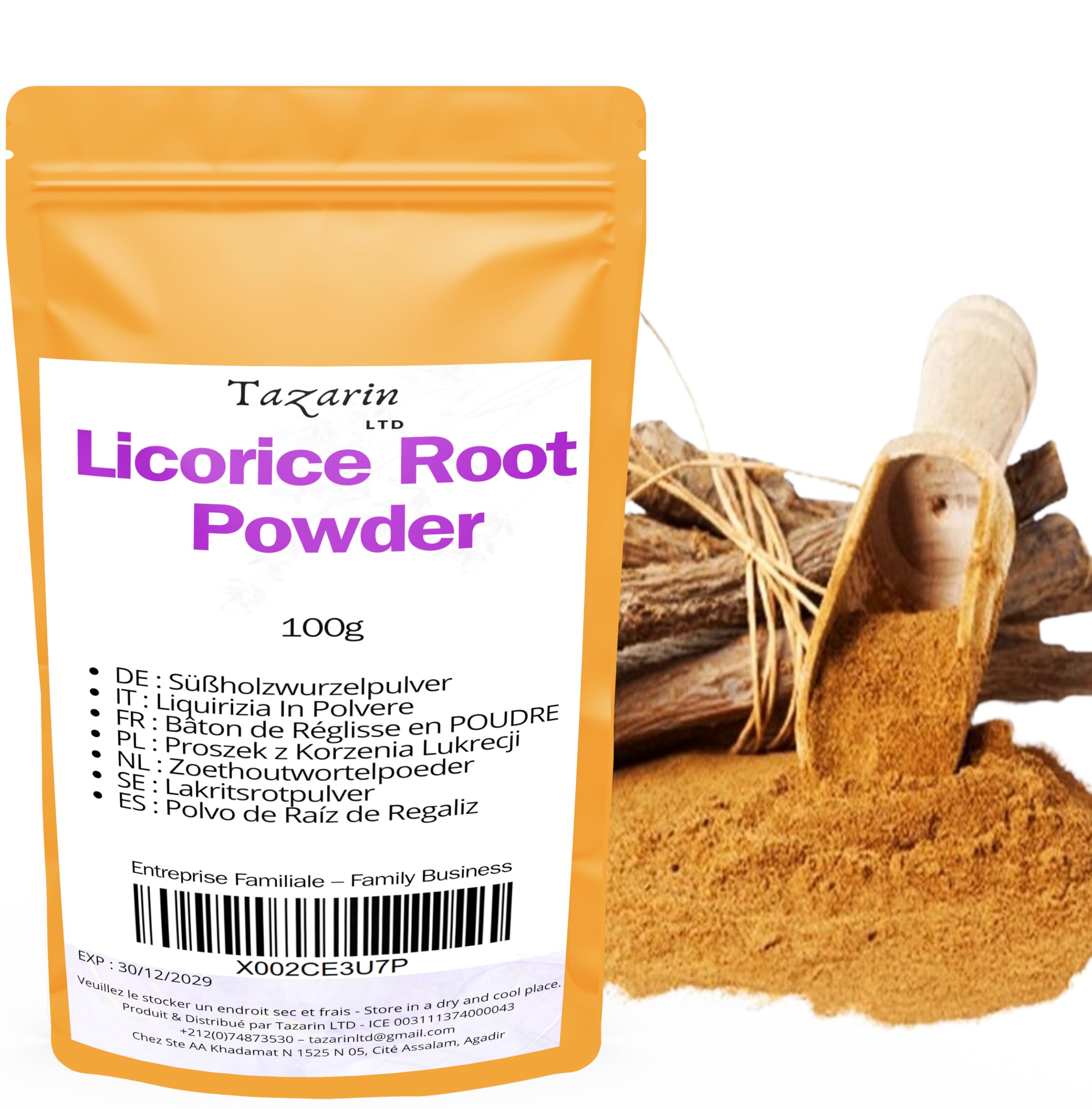 Ground Licorice - 100 Pure and Natural - No Additives or Preservatives Discover our licorice powder, made from carefully selected and finely ground licorice roots. This natural powder is ideal for preparing teas, home care products, culinary recipes, or cosmetic applications. Rich in flavor and active ingredients, it has been prized for centuries for its beneficial properties. 100 Natural and Pure: Whole licorice root powder – no additives, colorings, or preservatives. Superior Quality: Gently dried and ground to preserve all its properties. Versatile Use: Perfect for infusions, skincare, hair masks, Ayurvedic applications, baking, and more. Intense and Authentic Flavor: Naturally sweet and powerful aroma – ideal for licorice lovers. Secure Packaging: Airtight, resealable bag for optimal aroma protection. Satisfaction guaranteed: Carefully checked and packaged – Returns accepted if you are not 100 satisfied. INGREDIENTS 100g ground licorice root